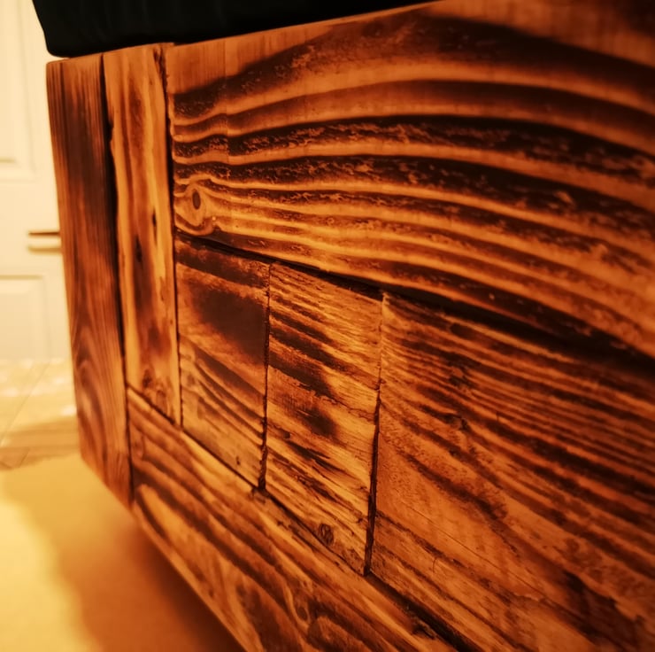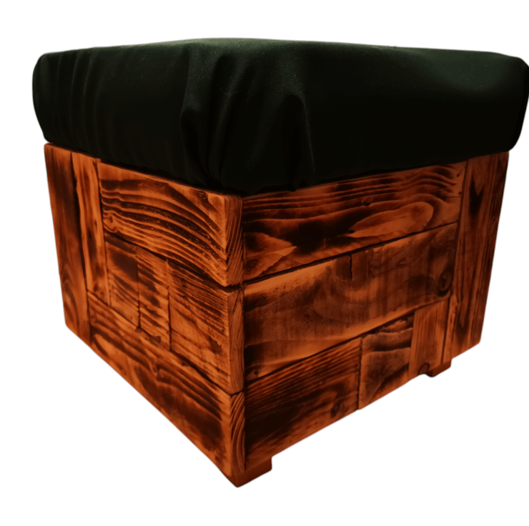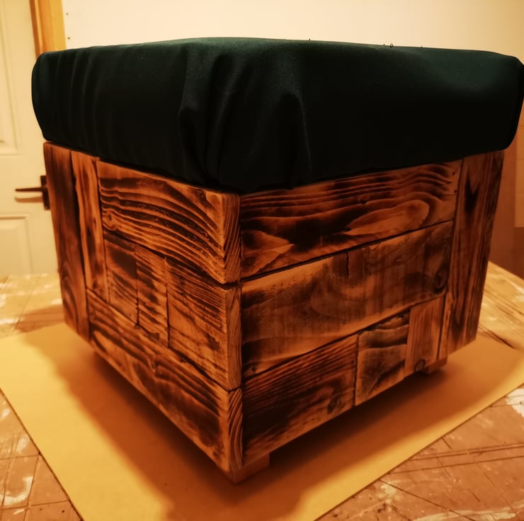 Made from recycled pallet wood with a cushioned covered seat in dark green fabric.