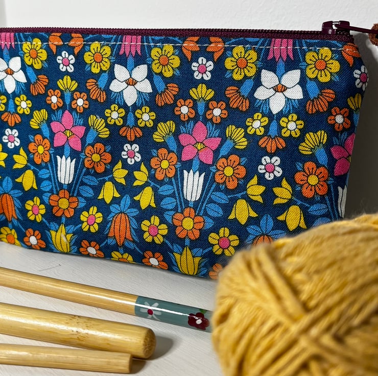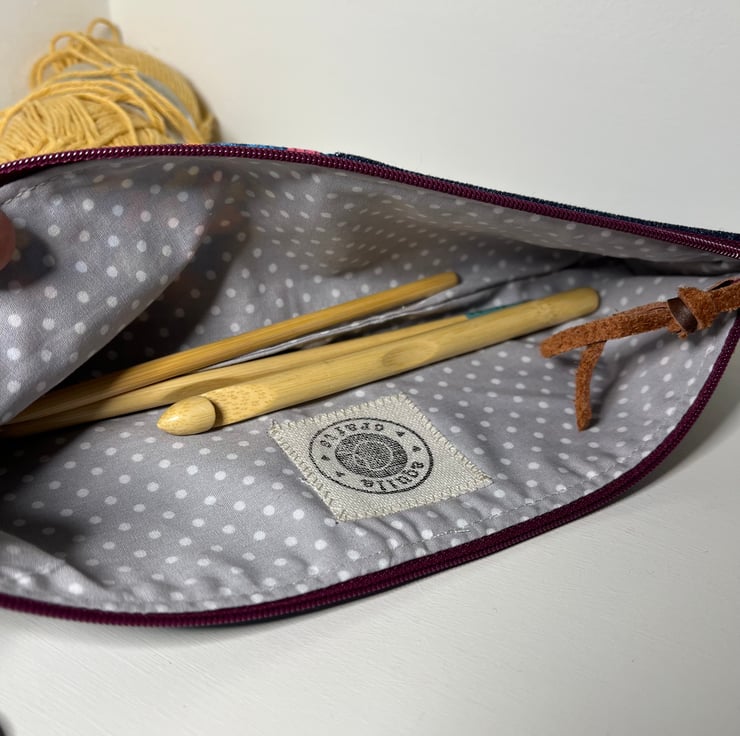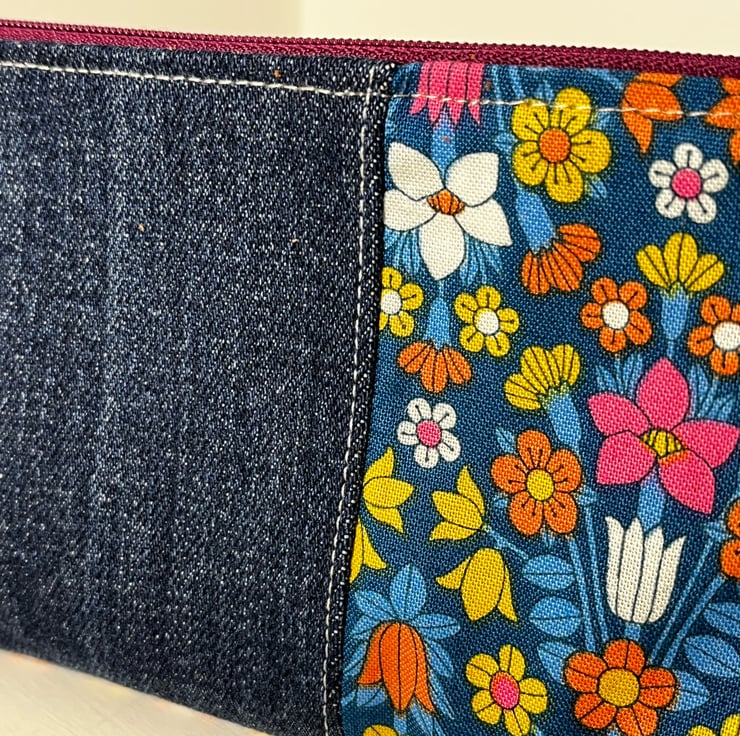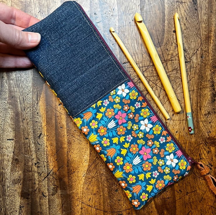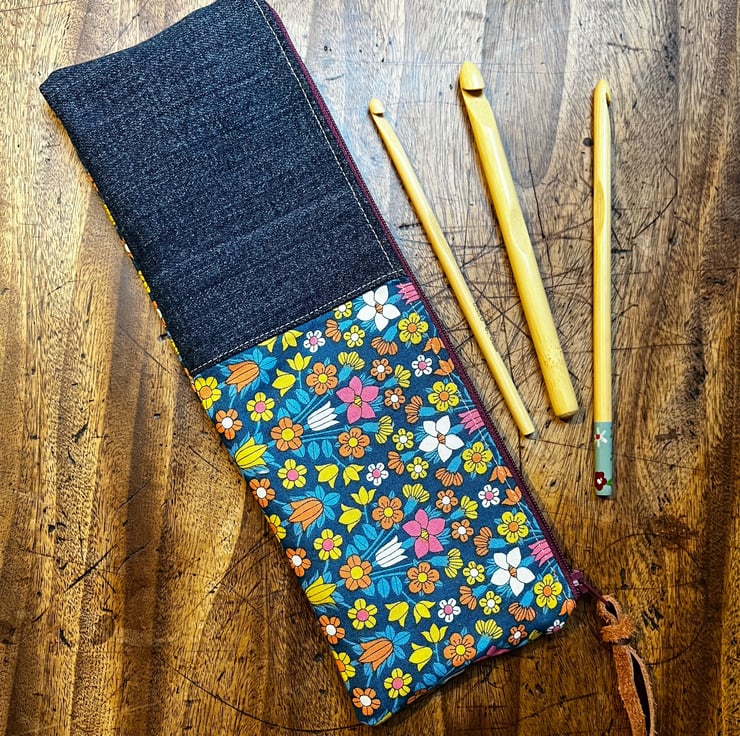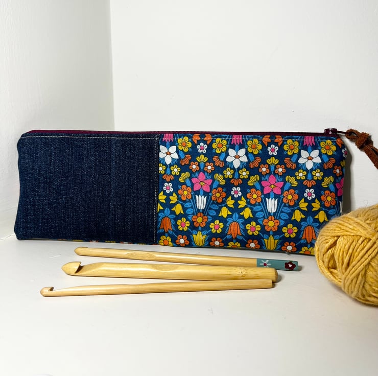 Pretty Liberty floral cotton and reclaimed denim zip pouch. The pouch is long and narrow, ideal for pencils or crochet hooks. It is fully lined with spotty grey and white cotton.