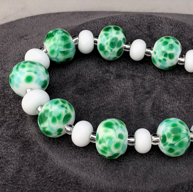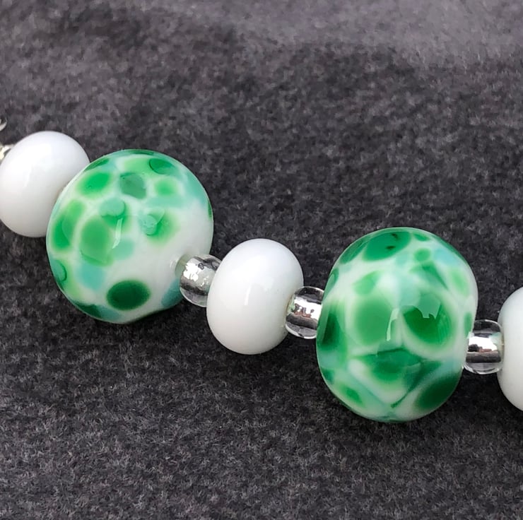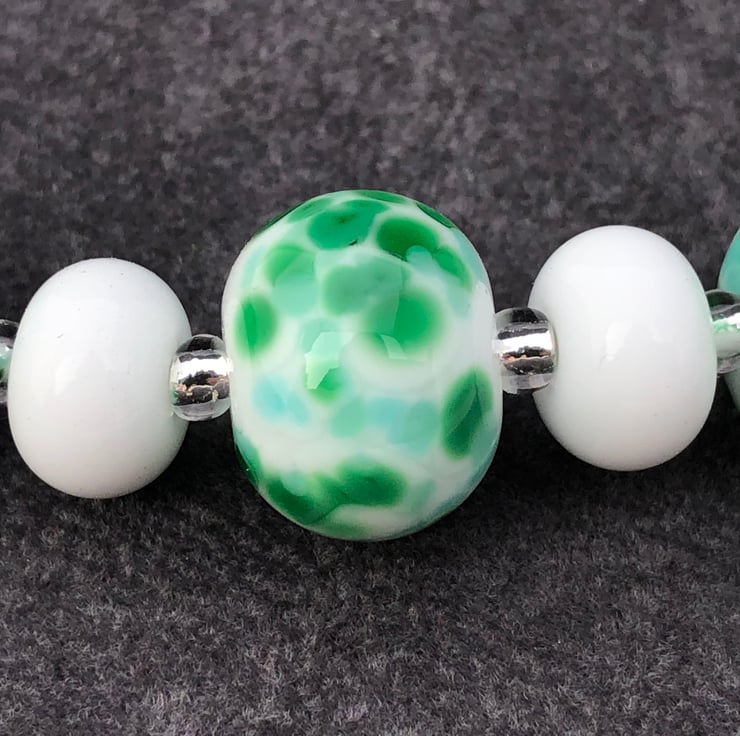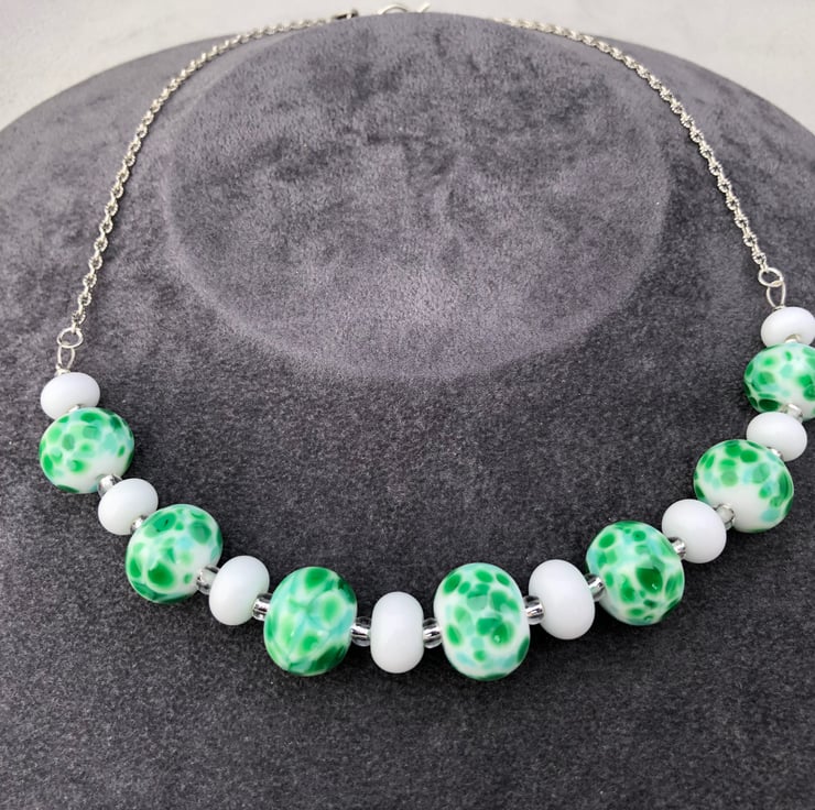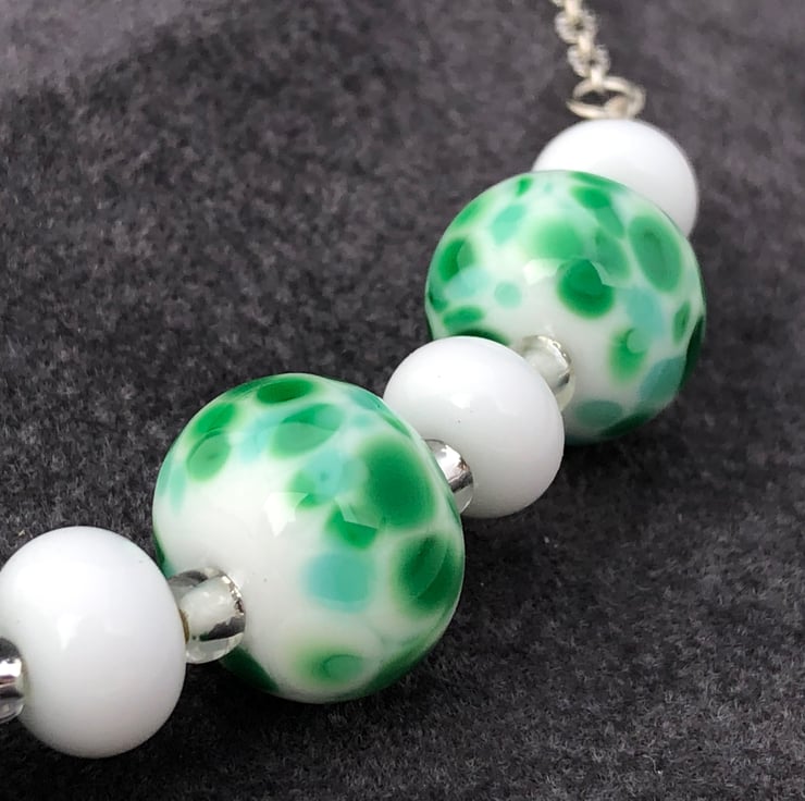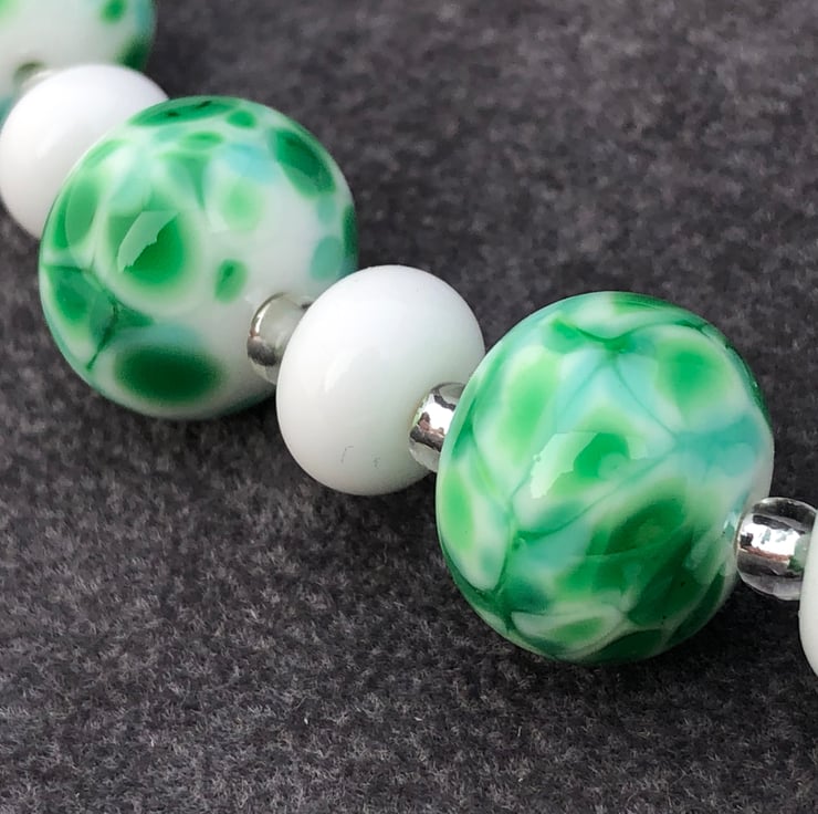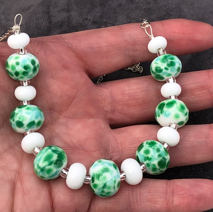 This beautiful and simple necklace design has been created by me using 15 of my own handmade lampwork glass beads, 7 of which are white with small pieces of glass in green shades melted in to give a speckled effect (diameter of the beads 13-15mm), 8 of the glass beads are plain white (diameter of the beads 8-10mm).