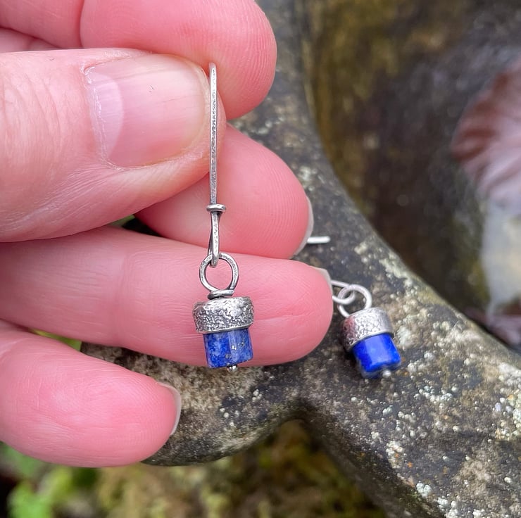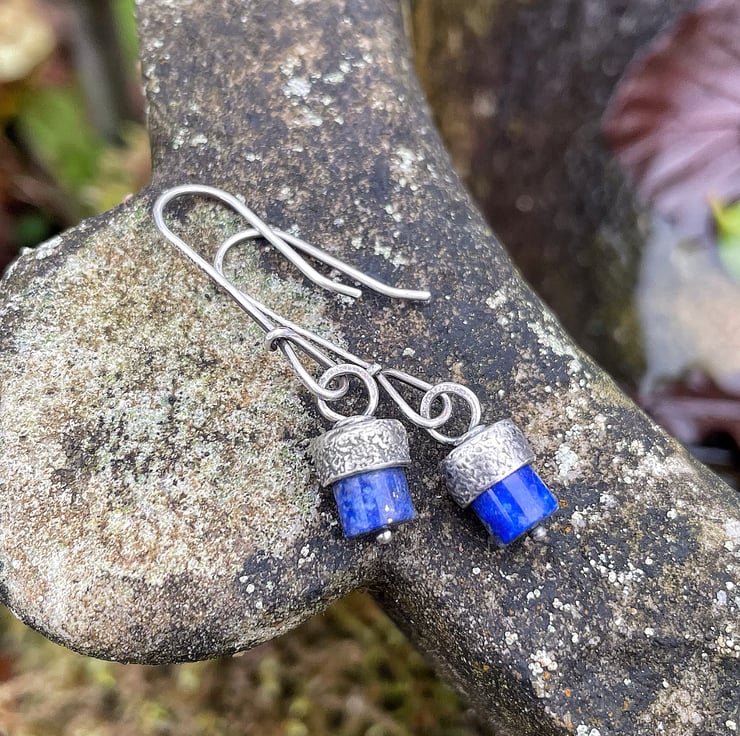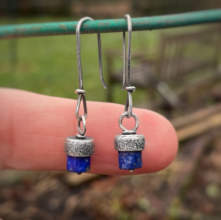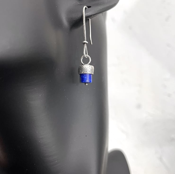 Blue lapis drum beads with a textured silver cap, hang from long hand made ear wires.