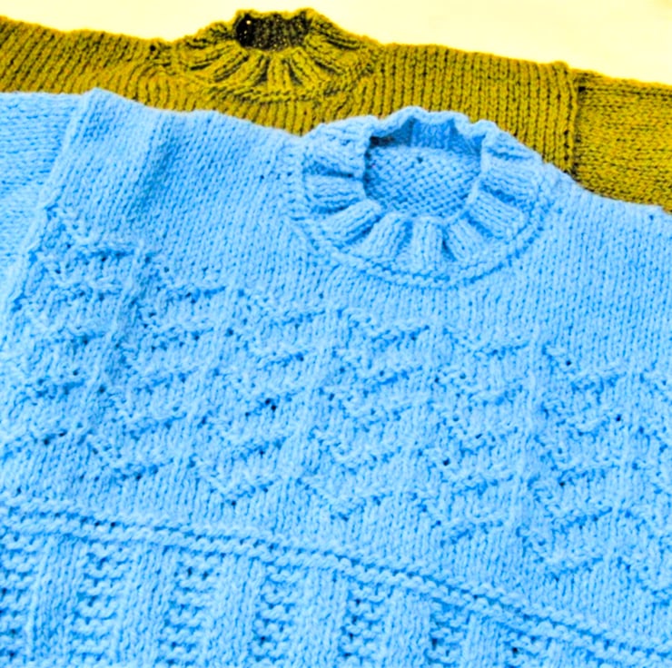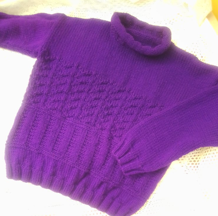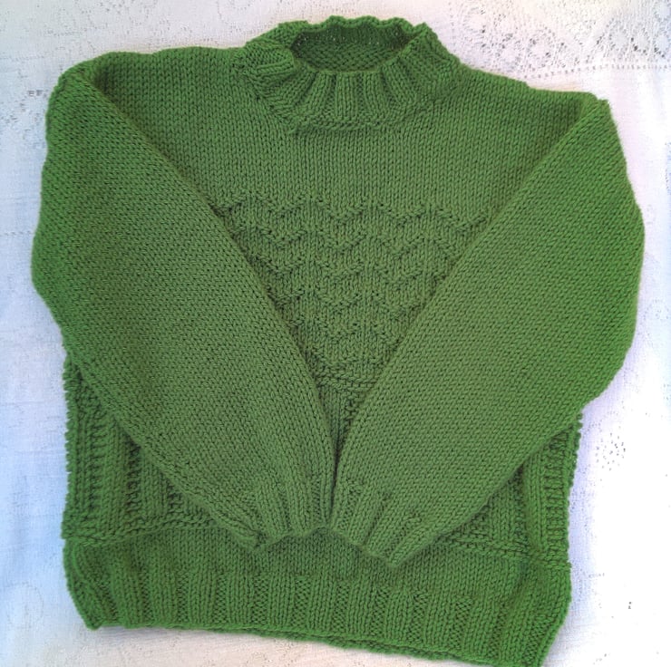 Jumper with a rib and arrow pattern, hand knitted in an aran weight yarn to give an additional warmth to the garment. The jumper is not in stock but it can be made in a colour and size of your choice, please state the colour required when you order. Available sizes, and prices, are shown below. The jumper can be made with either a roll neck or a round neck, please choose which you would like when your order. The processing time for this jumper will be 1 - 2 weeks to produce and post to you.
