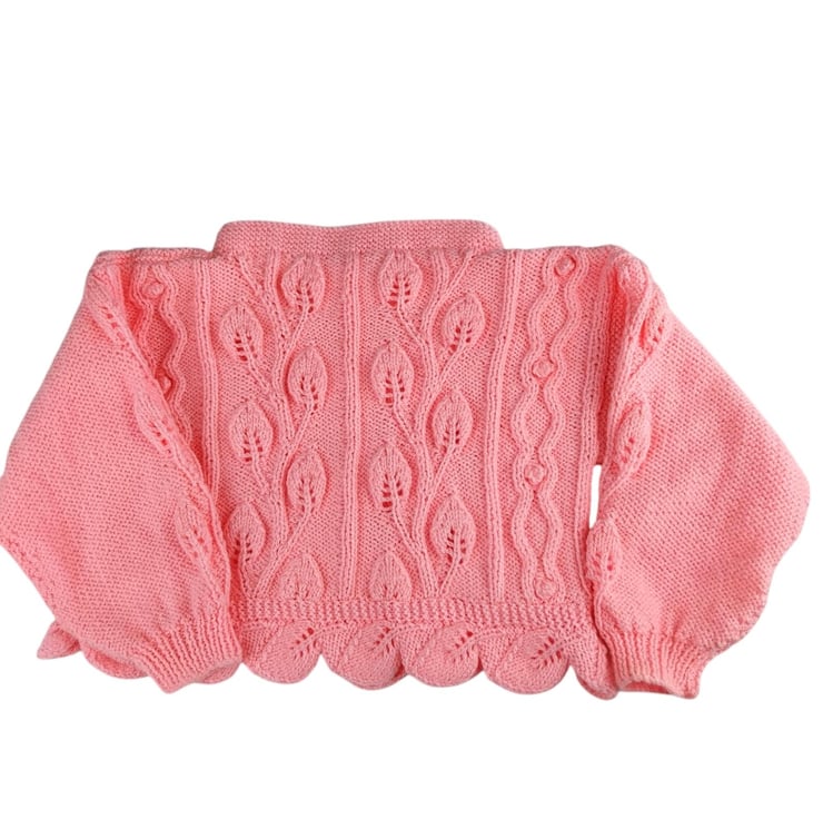 Check out this super cute hand-knitted baby cardigan in a lovely candyfloss pink! Featuring the classic old shale stitch from Shetland, it’s a stylish and traditional choice, perfect for special occasions like christenings or just to dress up your little one.