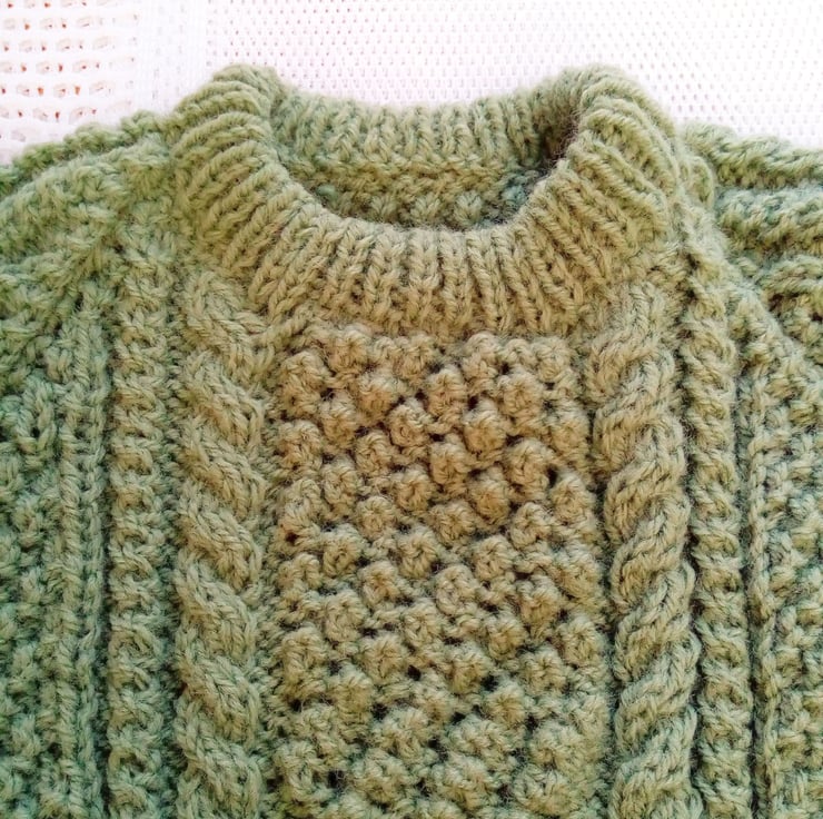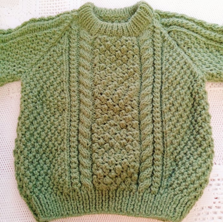 Warm and cosy child's cable patterned jumper hand knitted in aran yarn for additional warmth. The jumper is in stock in this sage green colour and it can also be made especially for you in a colour of your choice with either a roll neck, a collar or a round neck. Available sizes are shown at the bottom of this listing and please state the colour required when you order. The processing time for this jumper will be approximately 1 - 2 weeks to produce and post to you.