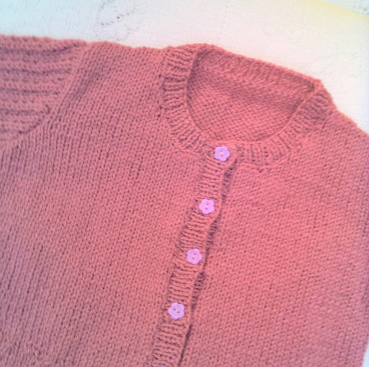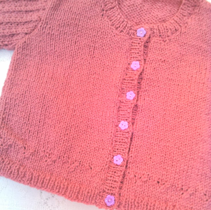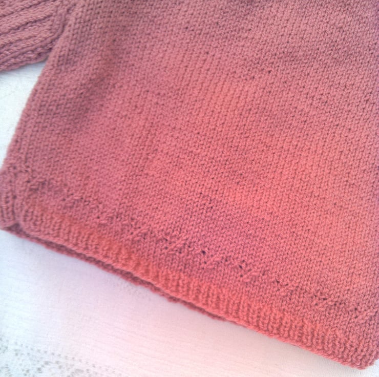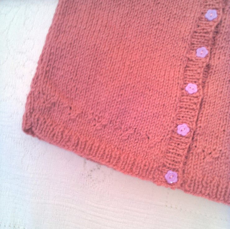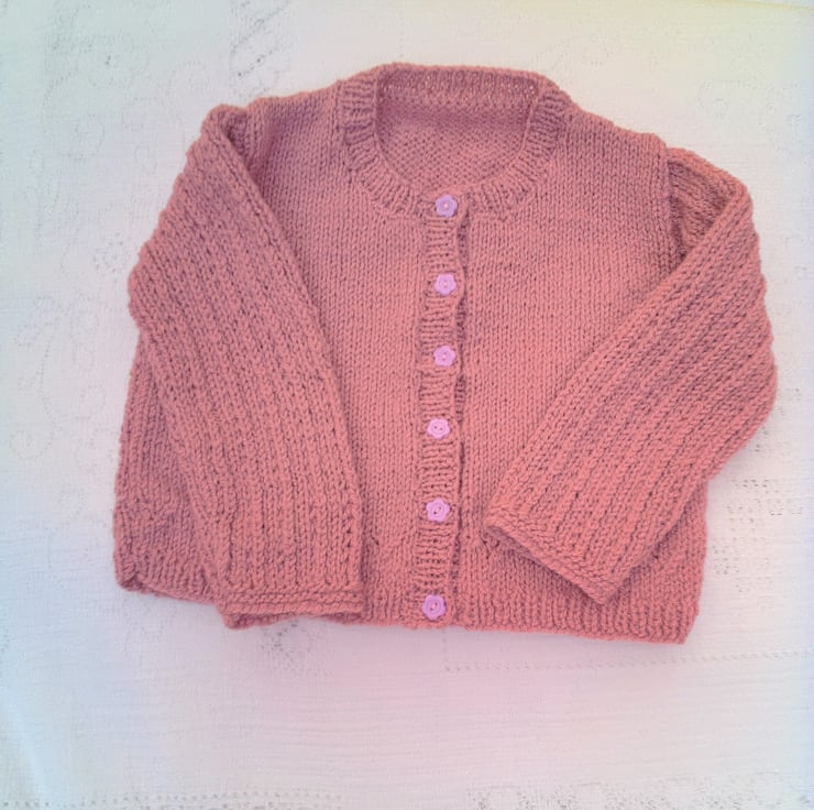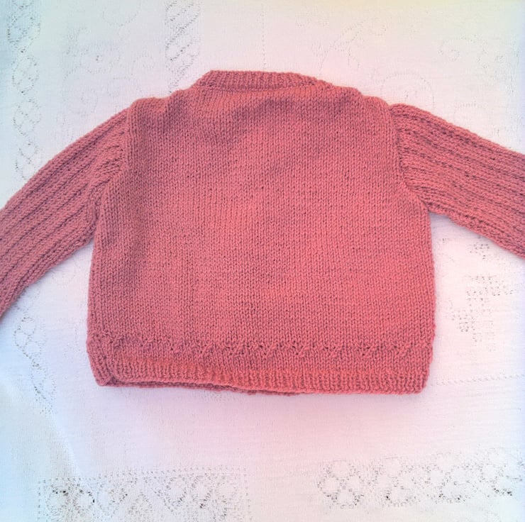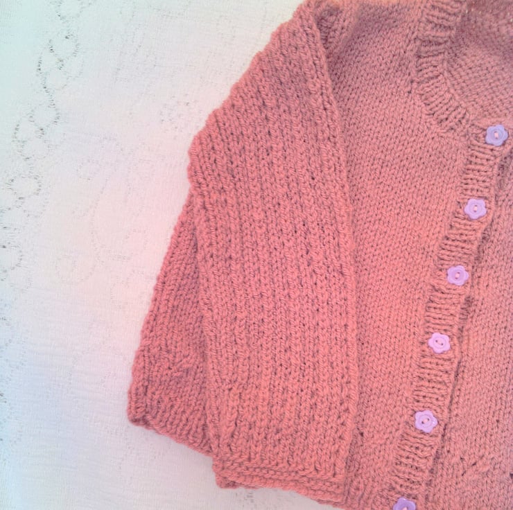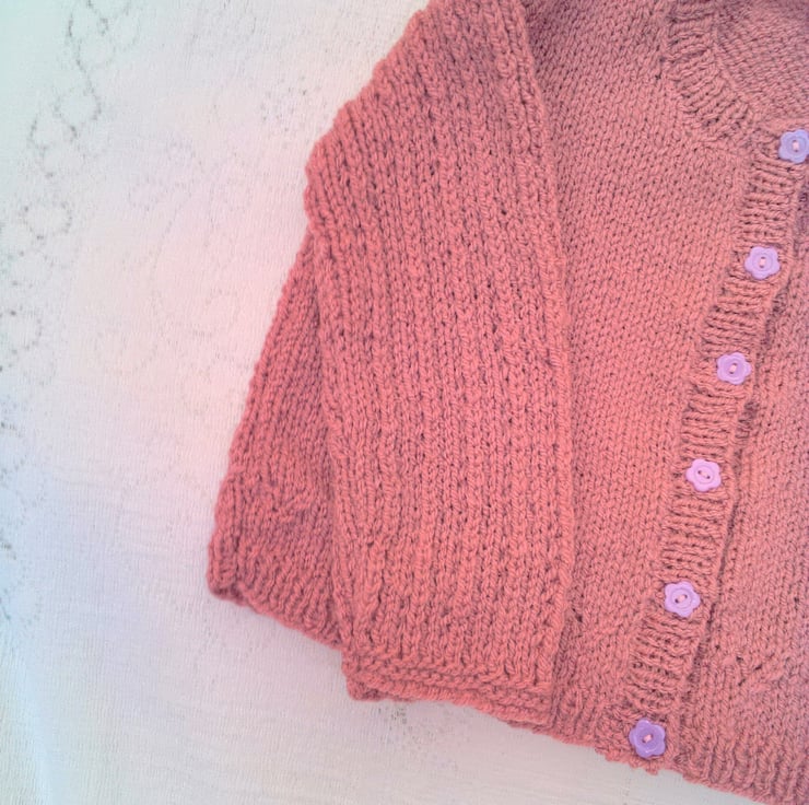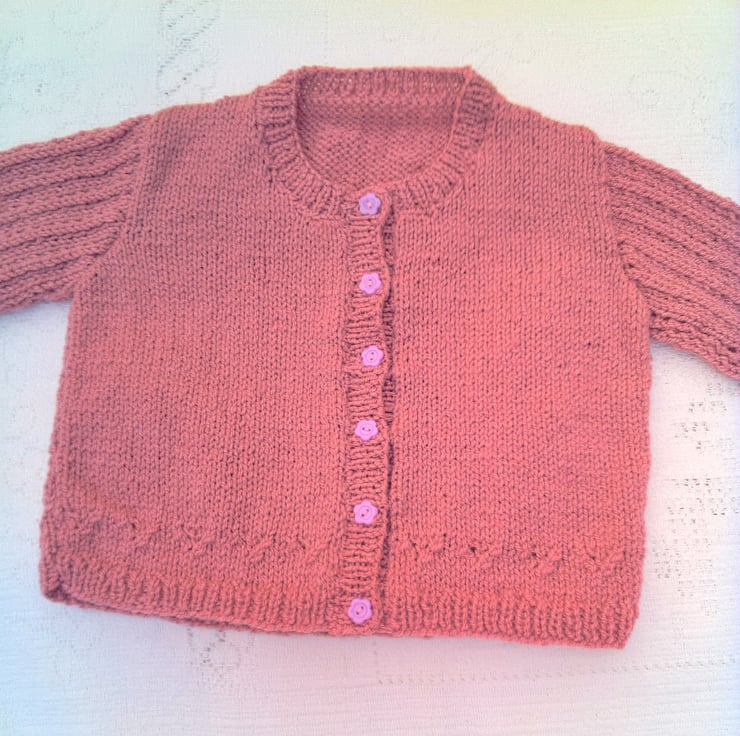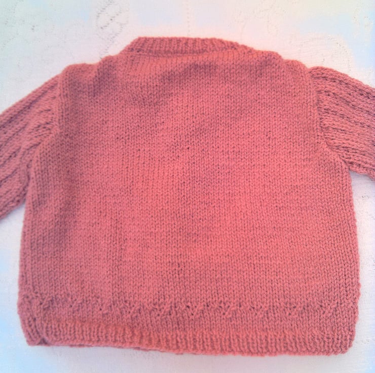 Very pretty cardigan with inset lacy patterned sleeves and a patterned border is hand knitted in double knitted yarn (colour shown in photos is a dusky rose colour). It is not currently in stock but can be made for you in a size and colour of your choice. Available sizes, and prices, are shown below and please state the colour required when you order. Please allow 1 - 2 weeks for it to be made and posted to you. The cardigan would make an ideal gift for a baby shower, a newborn baby or as a Christening gift. It can also be a gift to keep your little ones warm on a chilly day.