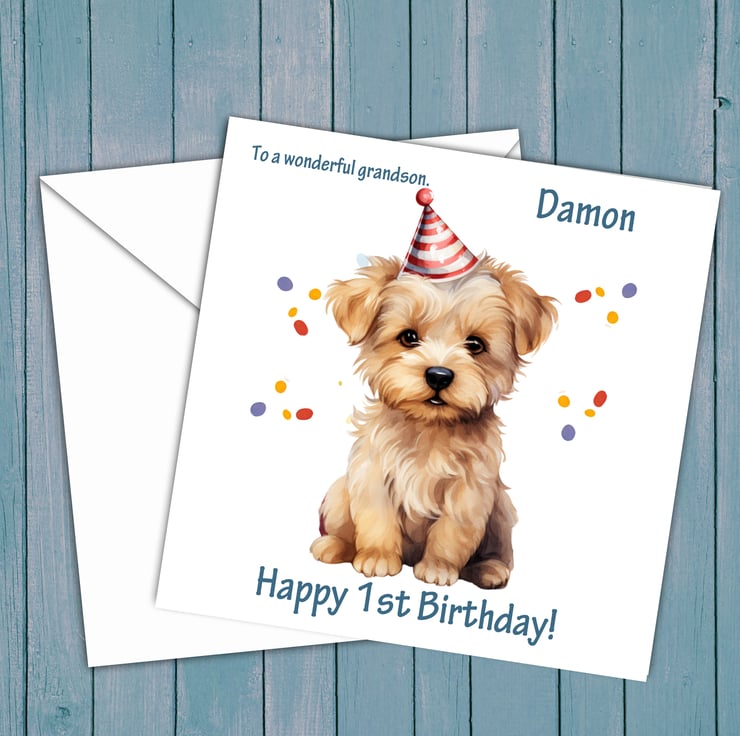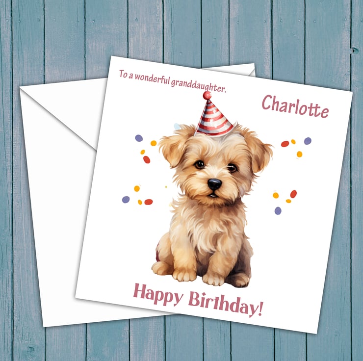 A 5.5 inch square card featuring a cute dog wearing a party hat and with splashes of colour around him.