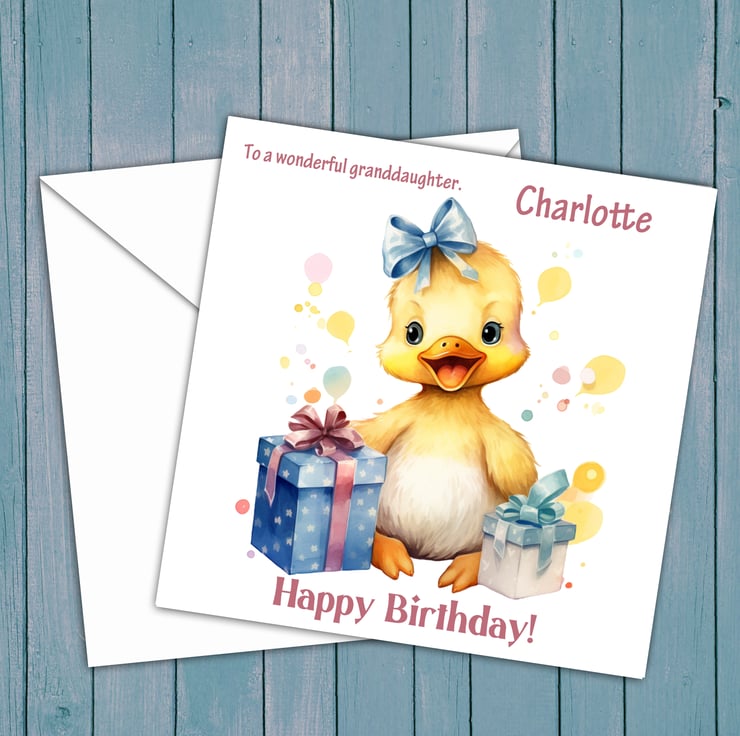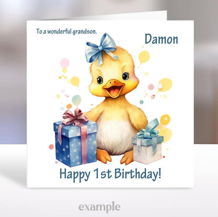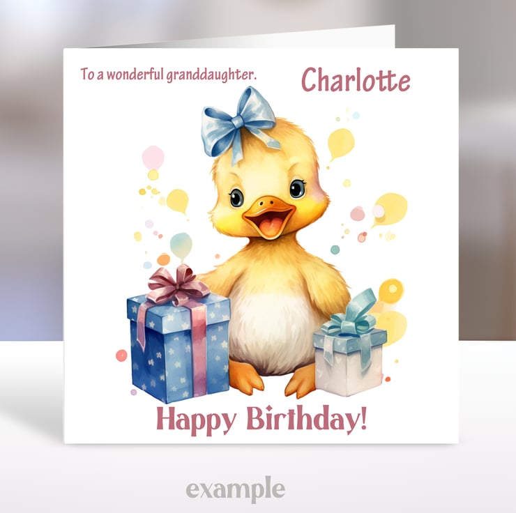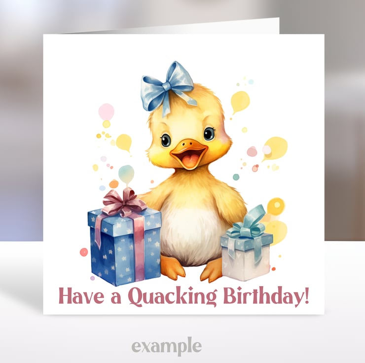 You can choose to add a name and your relationship to the recipient, and the age. Otherwise the card will simply say 'Happy Birthday on the front in either pink or blue or Have a quacking birthday in pink or blue.