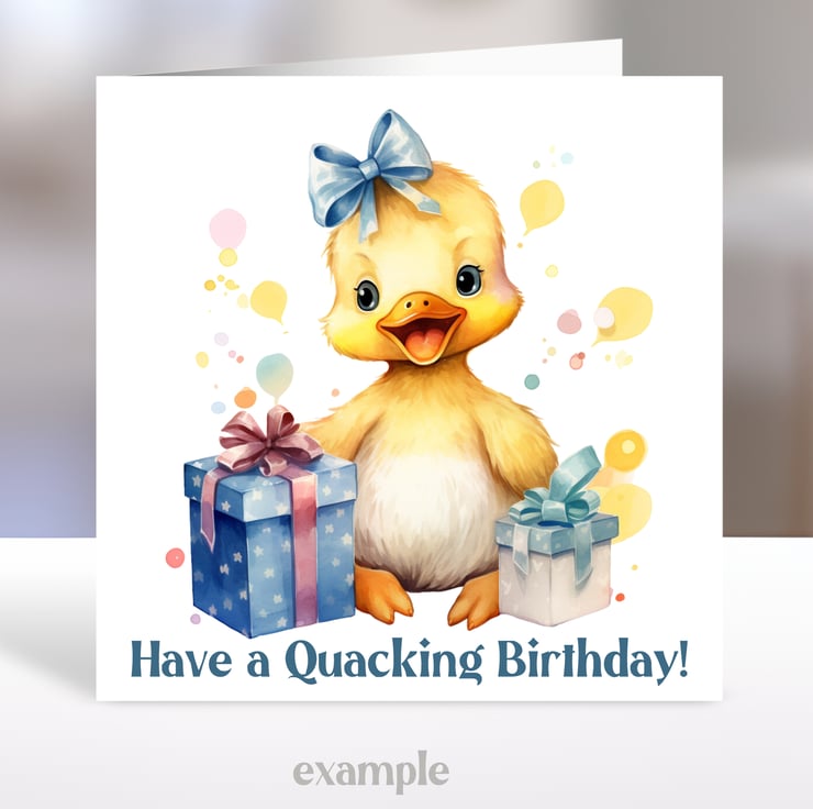 A 5.5 inch square card featuring a cute duckling wearing a blue bow and with presents and splashes of colour.