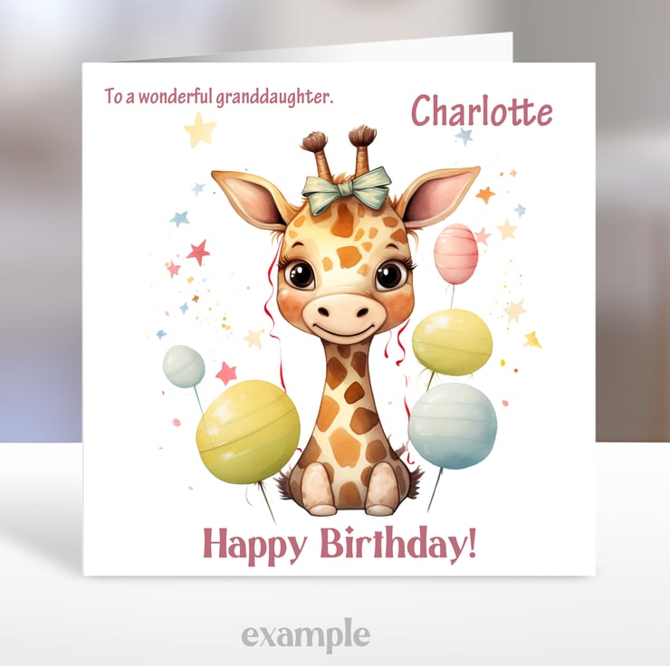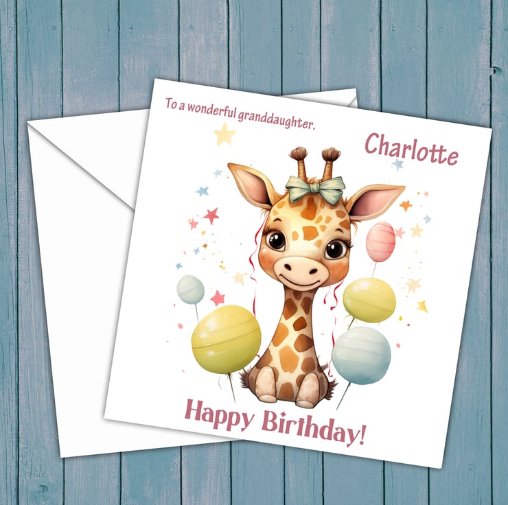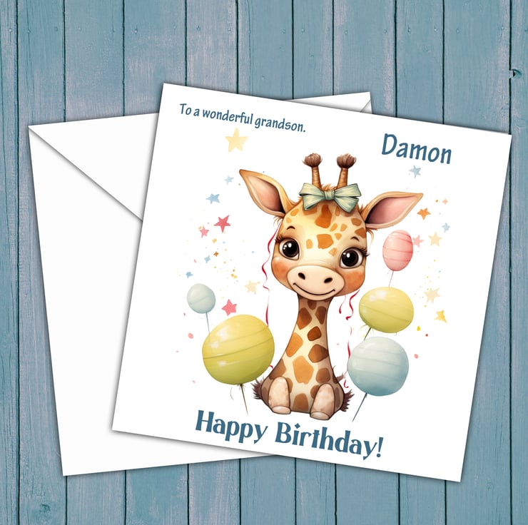 A 5.5 inch square card featuring a cute giraffe with balloons and stars