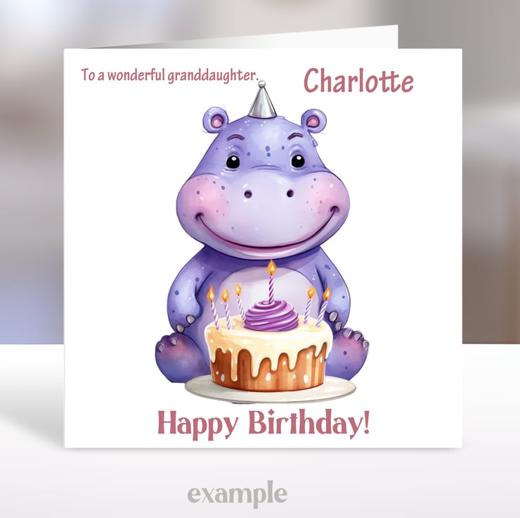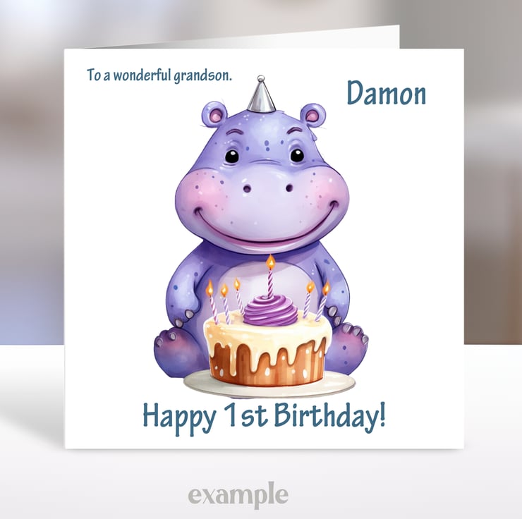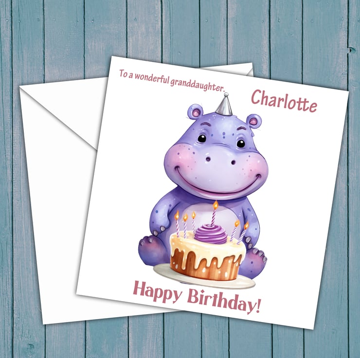 A 5.5 inch square card featuring a cute Hippo with a birthday cake.