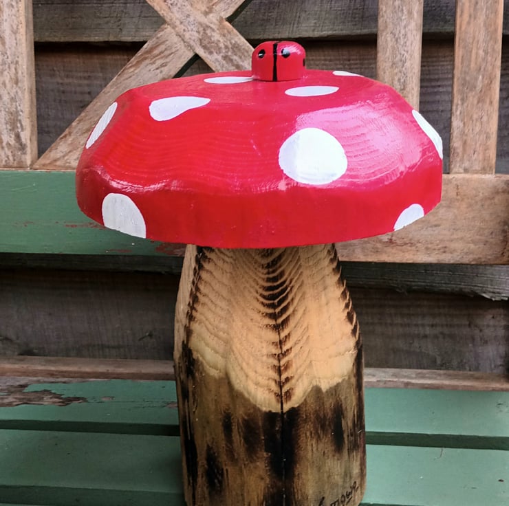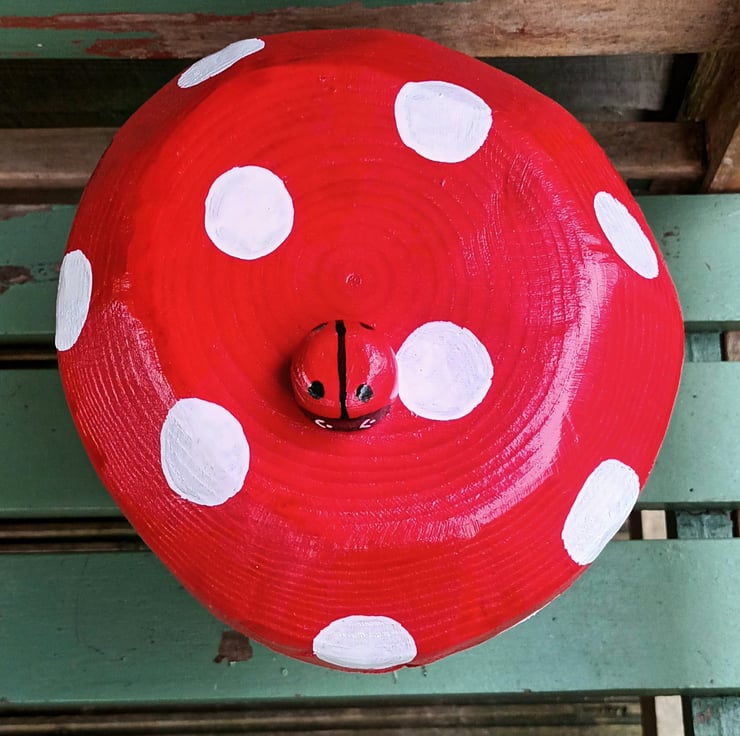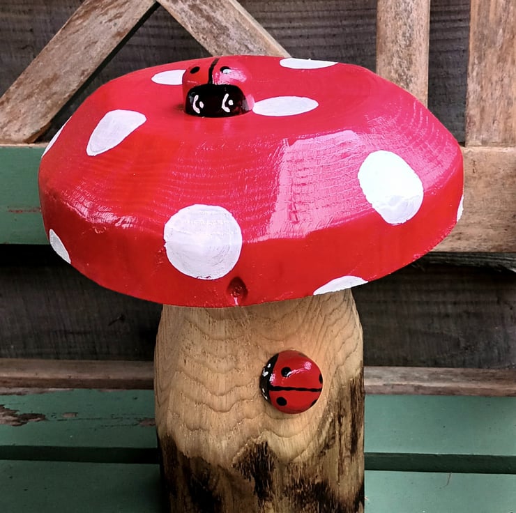 It is made of two pieces of wood securely attached together and has been chainsaw carved then sanded. The spotty top is decorated with weatherproof red and white paints. The little ladybirds are also handmade.