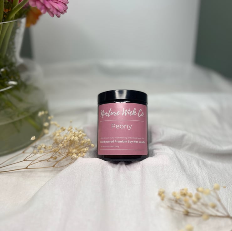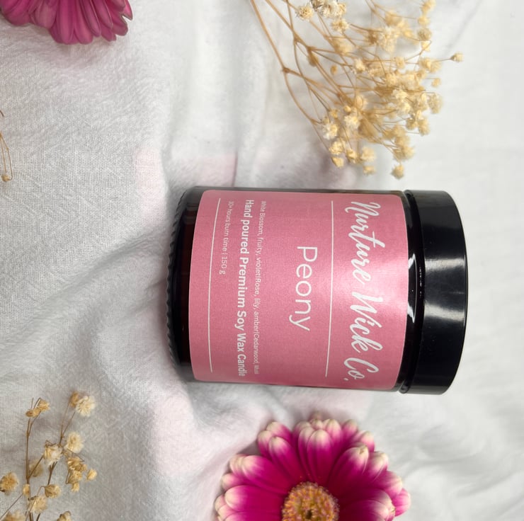 Experience the soft elegance of springtime with our Peony Soy Candle. This candle opens with delicate white blossom and fruity violet leaf, a beautifully layered floral scent, leading into a heart of blooming rose, lily, and warm amber. Subtle base notes of cedarwood and musk bring a gentle depth, creating a luxurious and calming aroma.