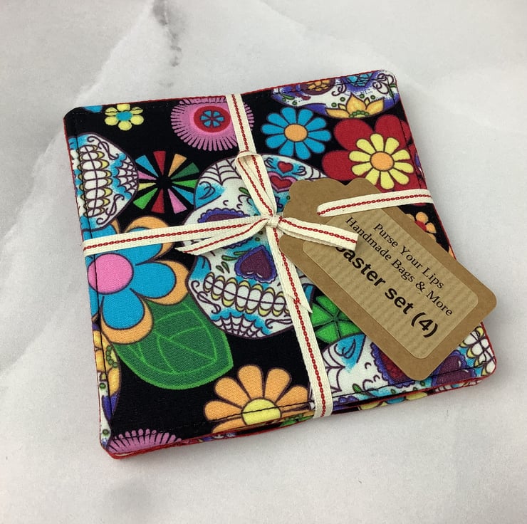 Handmade fabric coaster sets in a striking choice of gothic cotton fabrics and lined in complimentary cottons.