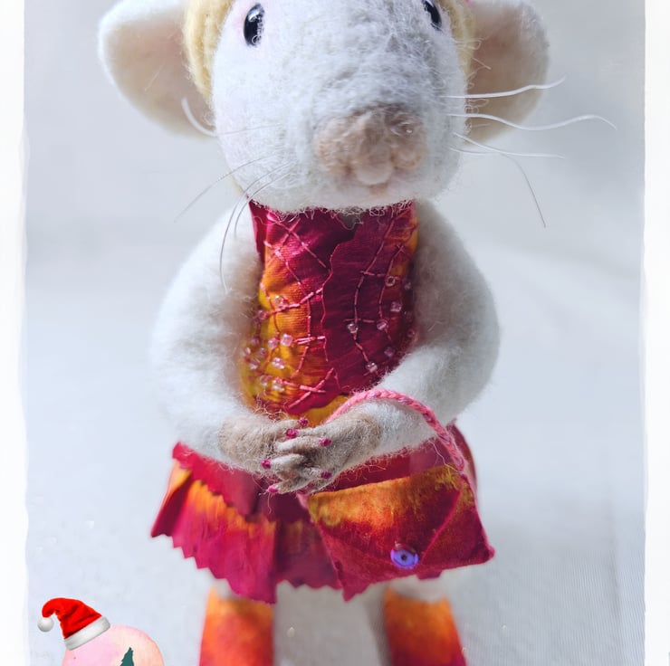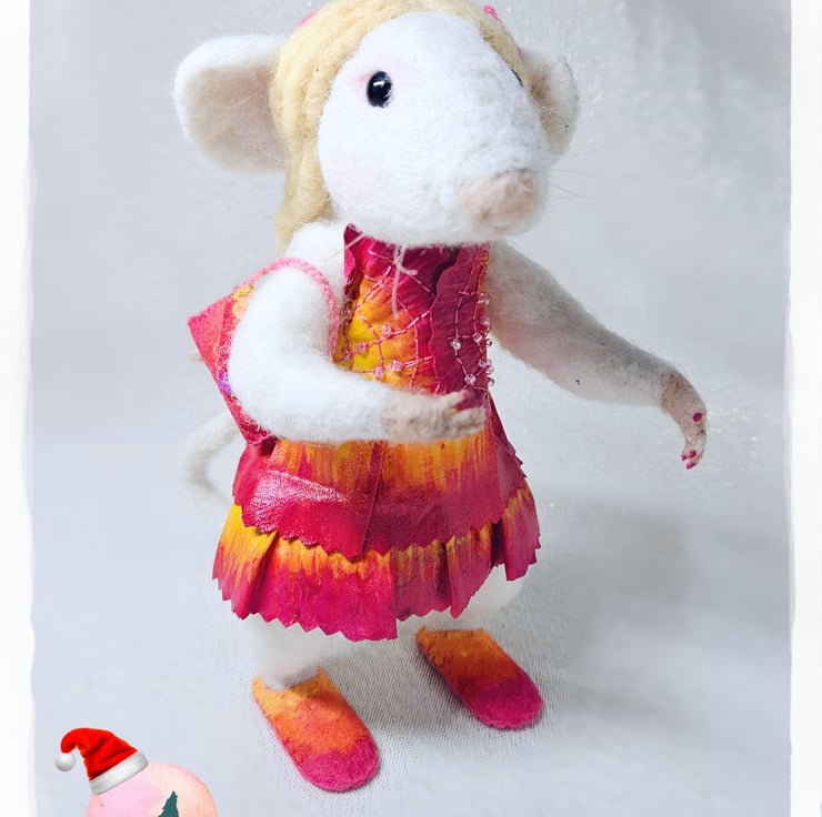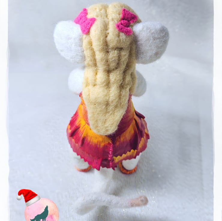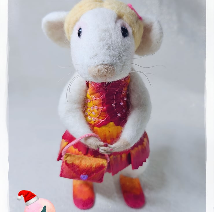 Glinda....Has a wire armature & stands 7.5 inches tall, her dress is inspired by the dress she wore at the Ozdust Ballroom, and Glinda mouse is fully sewn into the dress and made from felt and cotton. The dress has an embroidery pattern with seed beads to add sparkle and painted with the yellow to pink ombre look . Her hair and bows are needle felted & her bag and shoes are made from felt.