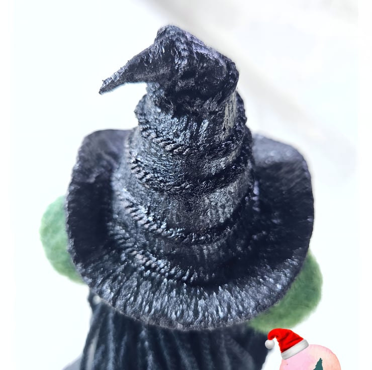 Elphaba....Has a wire armature and stands 8.5 inches tall to tip of her hat. She is sewn into the outfit and is one of the outfits she was wearing before the ball. Purple top with sheer fabric over the top with laces sleeves. The skirt of the dress with shiny swirls on it. Her hair is made from yarn, the hat is made from felt, yarn and card and is removable. The bag & shoes is made from faux leather and felt and is removable.