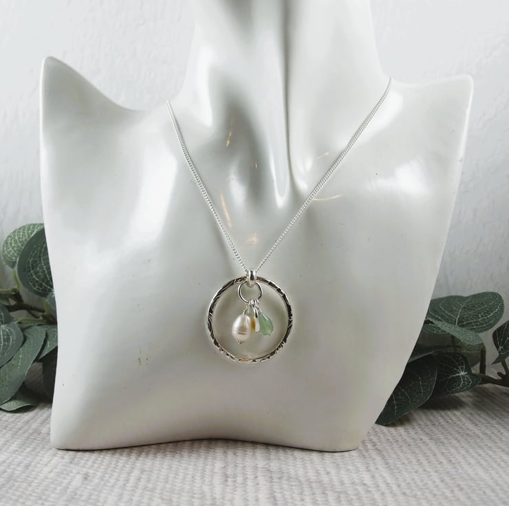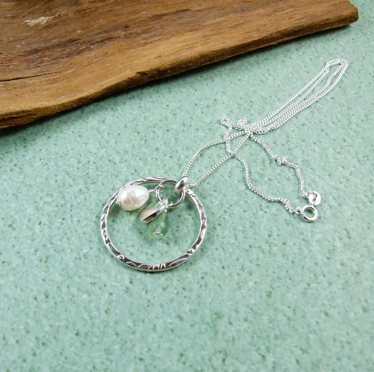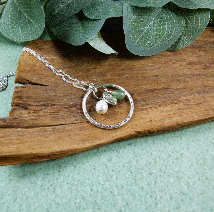 I created the outer circle using 2mm sterling silver wire then added the heart charm which I made from molten silver cast into a hand carved mould. Alongside this I have wire wrapped a small pearl and pretty green faceted agate bead.