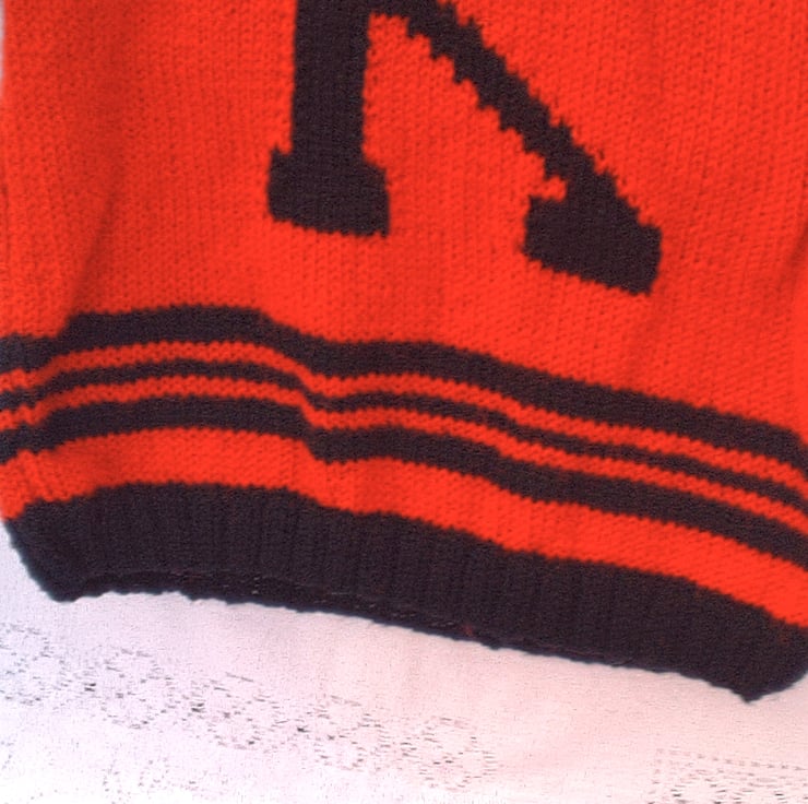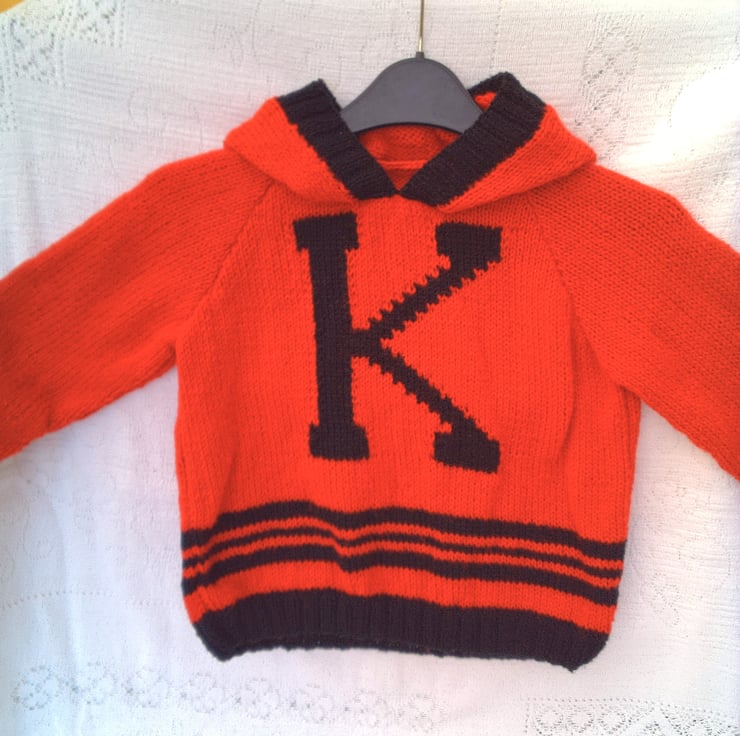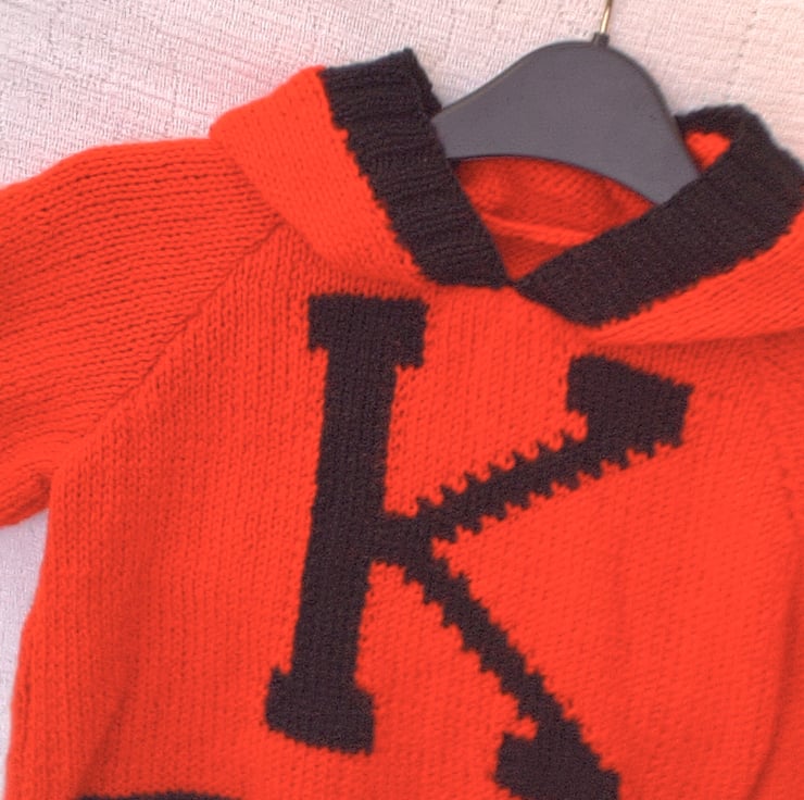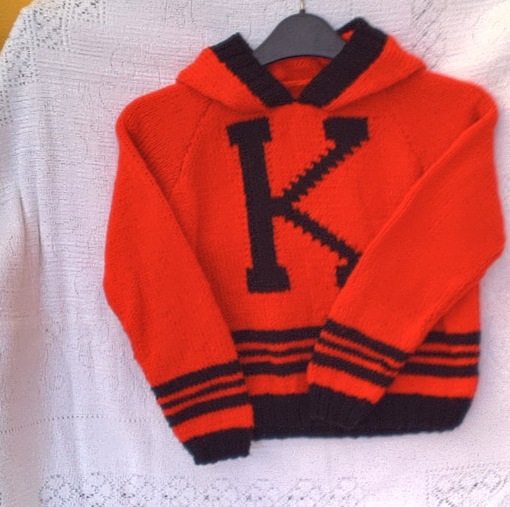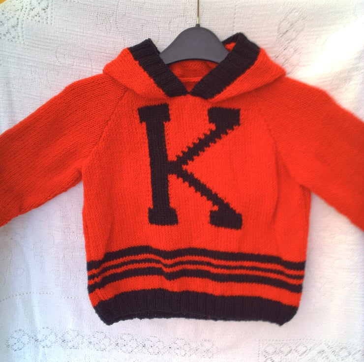 Child's Initial Design Hooded Jumper with Black Trim and Letter, Custom Make, Hand Knitted, Children's Clothes, Child's Jumper, Children's Hoodie, Birthday Gift, Baby Shower Gift