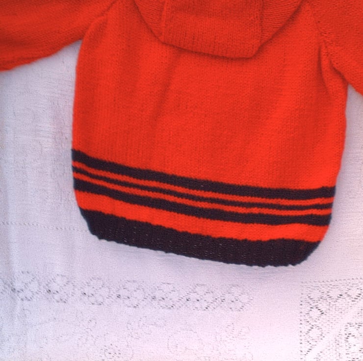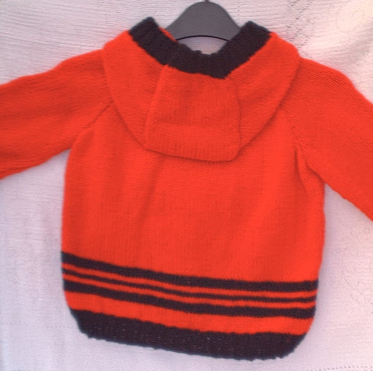 Hand knitted hooded jumper for babies and children from 6 months up to 6 to 7 years made using double knitting yarn. The jumper is not in stock but it can be made for you in a size and colour of your choice. Please see below for the available sizes and the corresponding prices and state the colour required when you order. Please allow approximately 2 weeks processing time for the jacket to be made and posted to you.