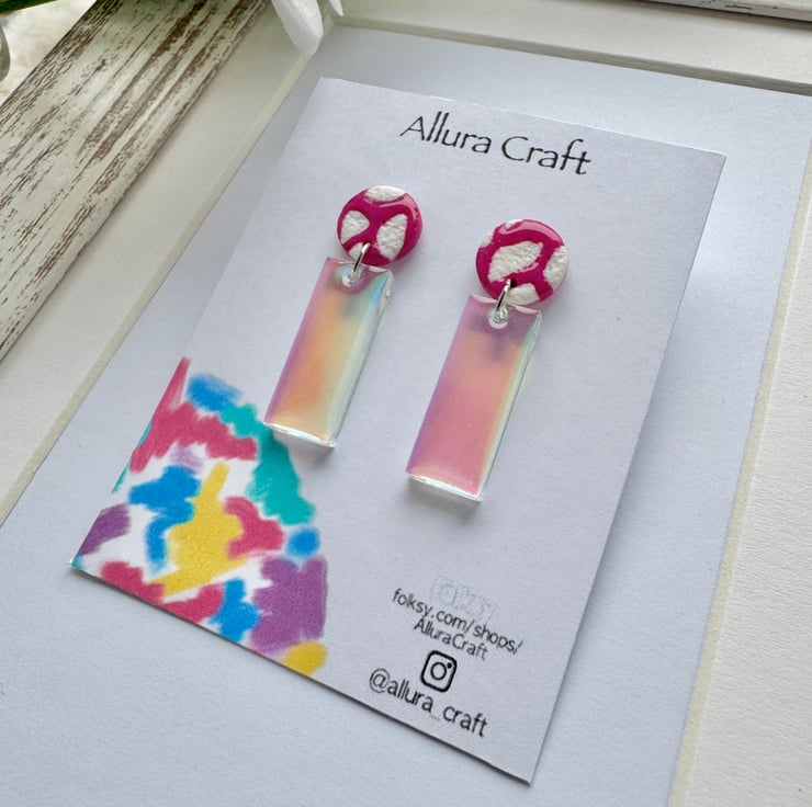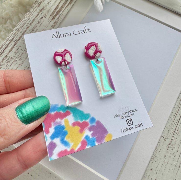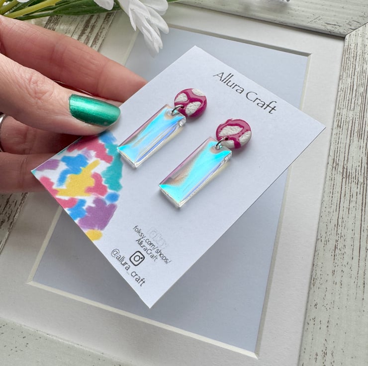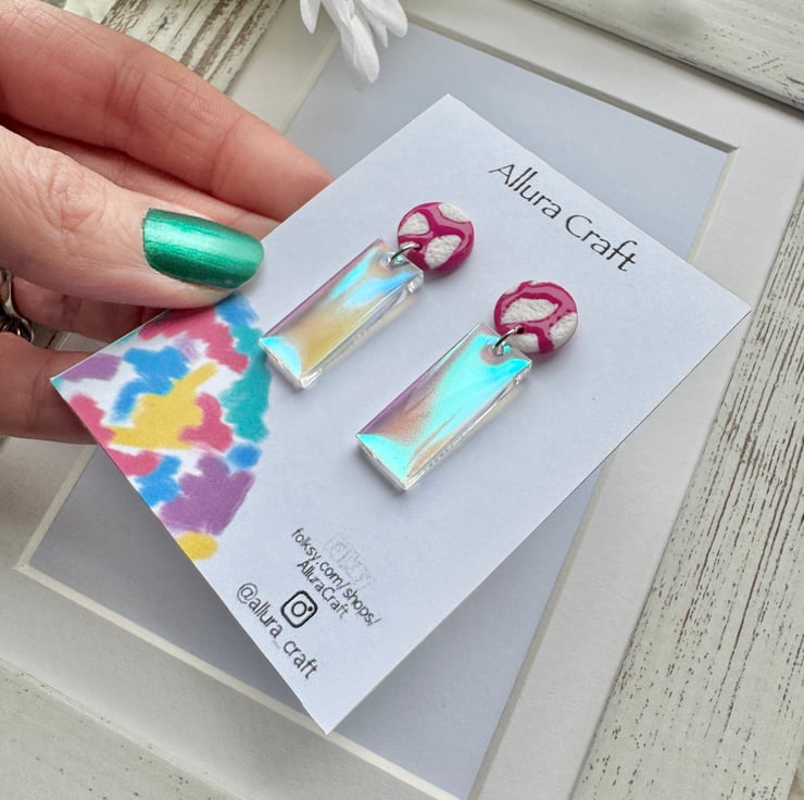 Attached to a beautiful flawless iridescent acrylic rectangle