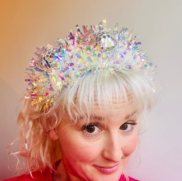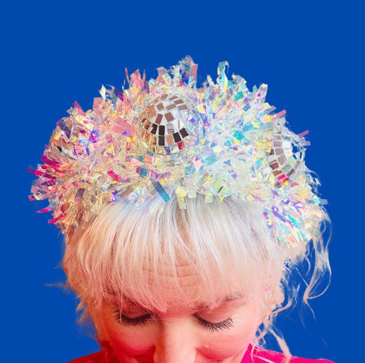 I LOVE disco balls and I wanted to design a headband that was comfortable and looked mega cool. I bought one piece of the iridescent crinkle with no idea what to do with it, and suddenly inspiration struck!