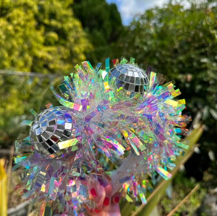 This headband is one of our original and best selling headbands, three shining disco balls with luxurious iridescent crinkle that sparkles like mad in the sun!
