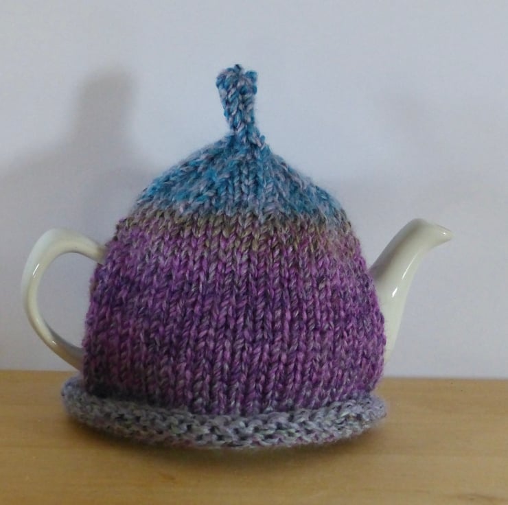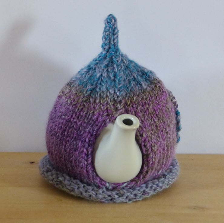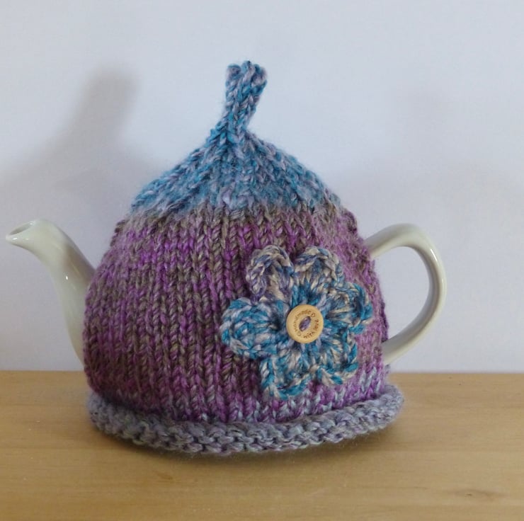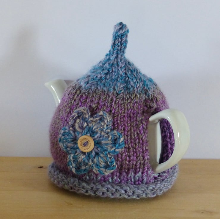 A hand knitted Tea Cosy in a chunky variegated yarn in shades of Purple, Blue and Light Brownetc. This cosy has a 'pixie' top and a crocheted flower, in the same yarn as the cosy, on the front for decoration. This has a small natural wood button in the centre with the words 'Handmade With Love'.