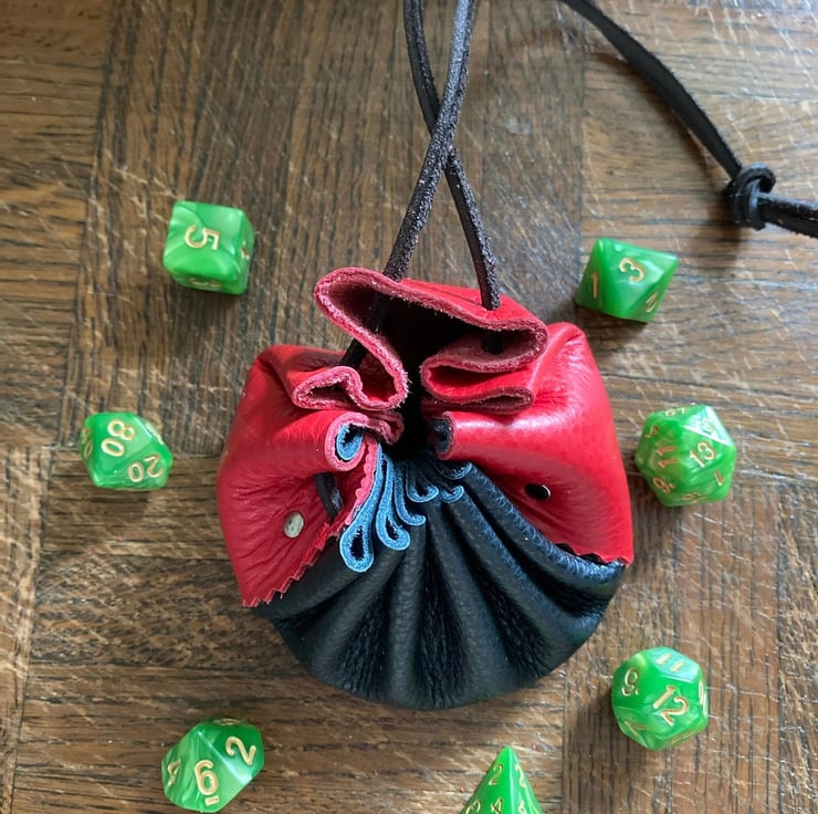 Small multi-coloured leather drawstring pouch -- Blaze Red & Ebony coloured leather