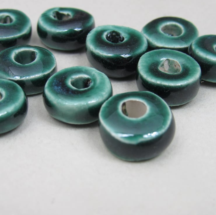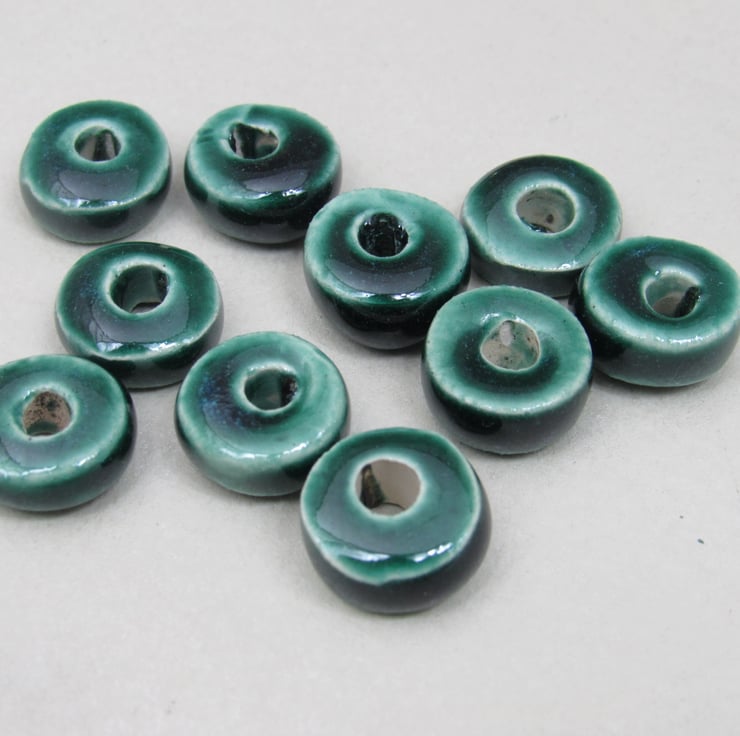 10 Small Emerald Green Glazed Ceramic Washer Beads