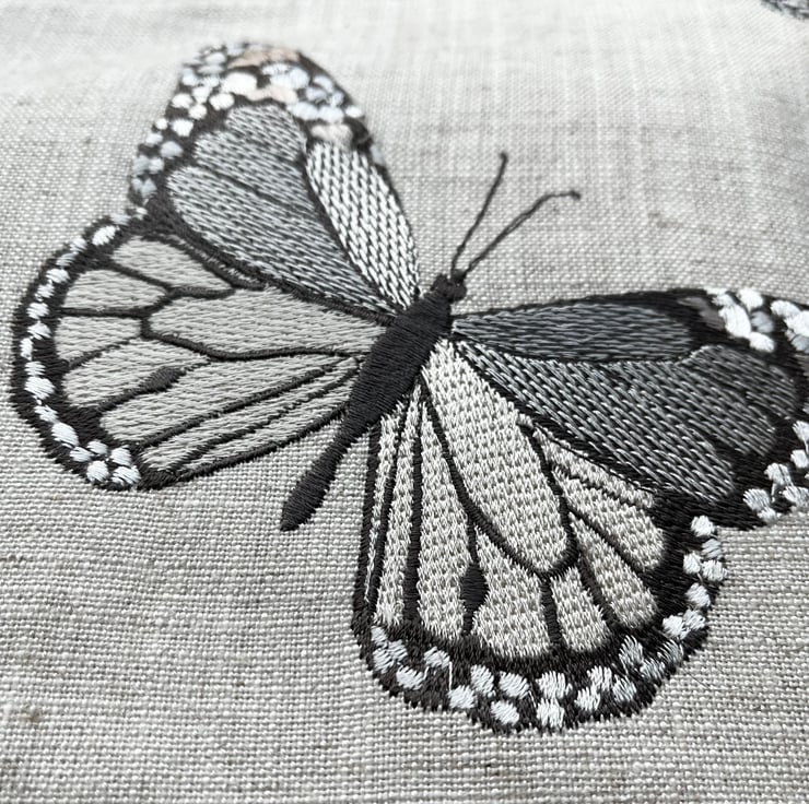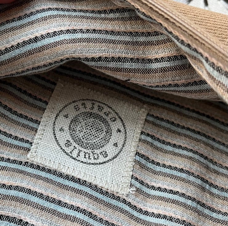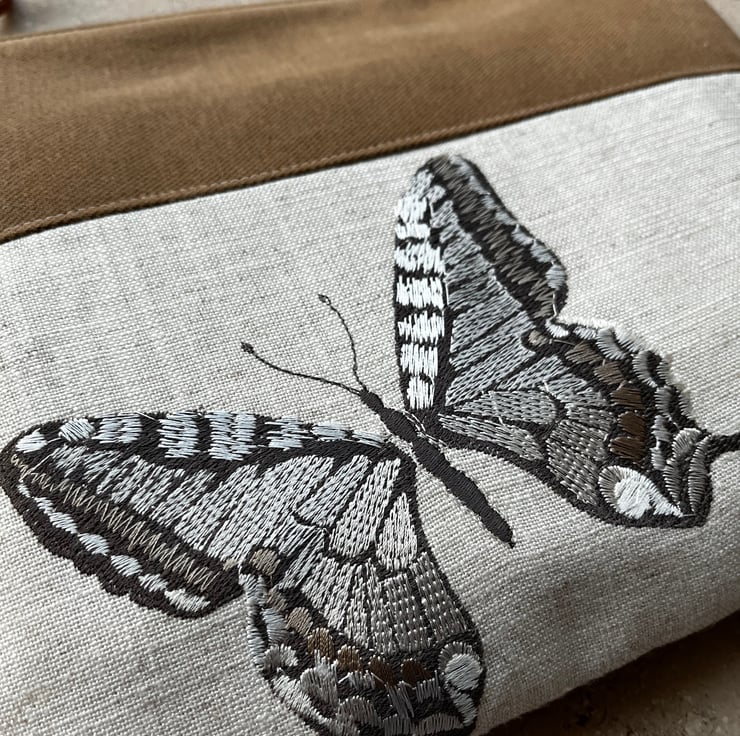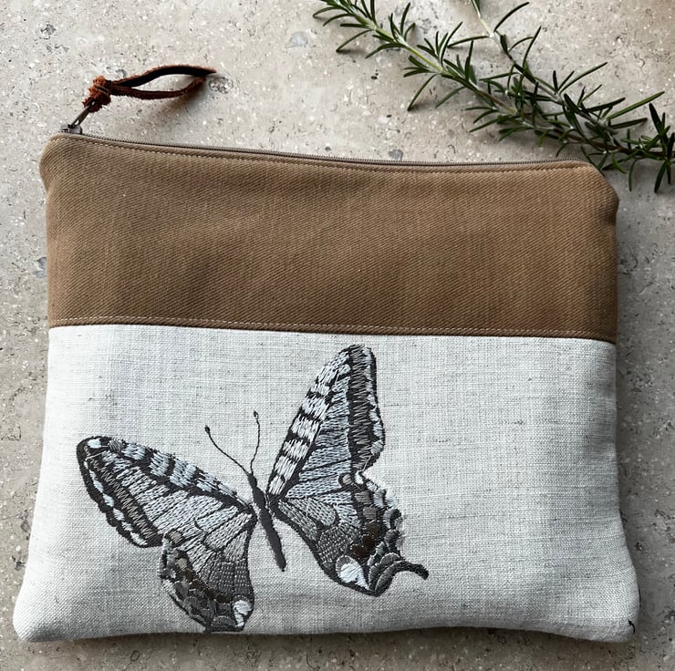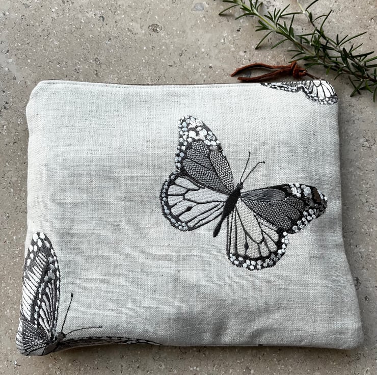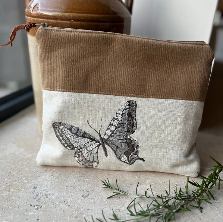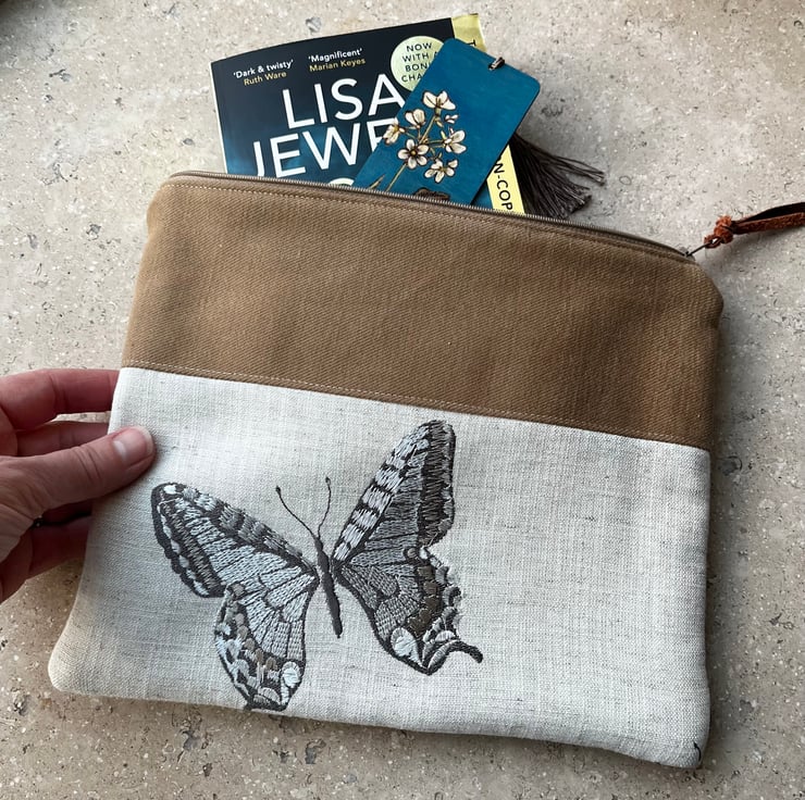 One of a kind soft zip pouch made from a sample swatch of beige linen-mix fabric with embroidered butterflies. I’ve teamed it with soft tan fabric and pretty striped fabric from more sample swatches. The pouch is a great size for a paperback book, purse and phone. It could also be used for small craft projects or cosmetics.