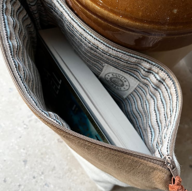 The pouch is fully lined and has a softly padded feel due to a layer of reclaimed interlining. The leather zip pull is a strip of leftover leather from a local upholsterer. This can be changed for ribbon if preferred.