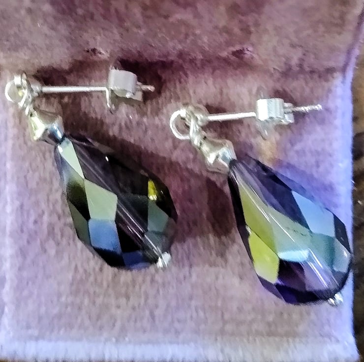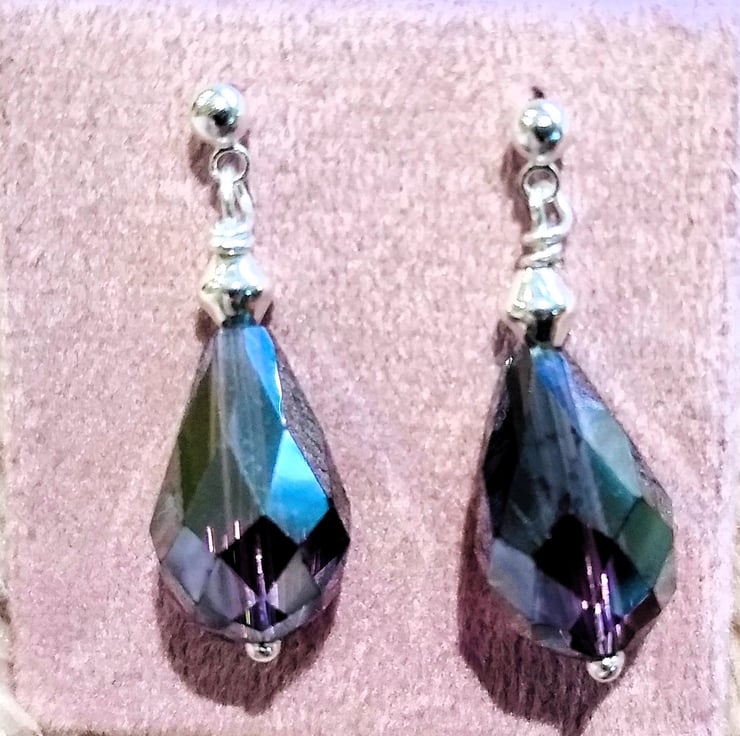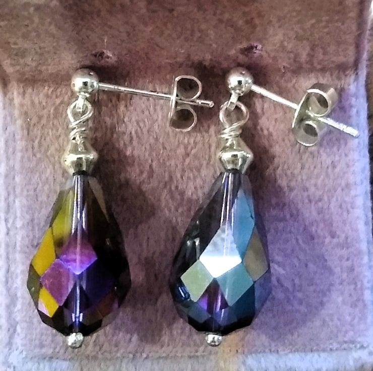 Sparkly minimalist style, purple faceted crystal teardrop shaped drop stud earrings. The crystal has a slight iridescent coating which gives it an oil on water rainbow like effect. Finished with a simple silver plated ear stud fitting. Drop length Approx 30mm