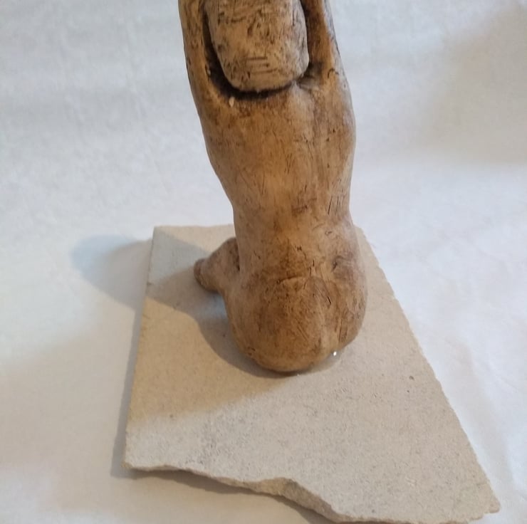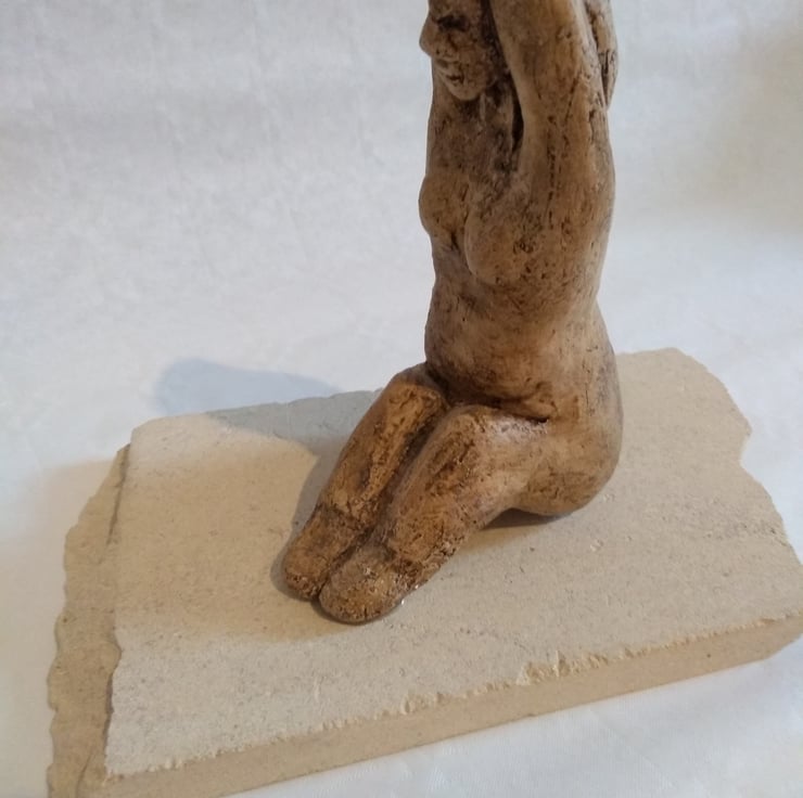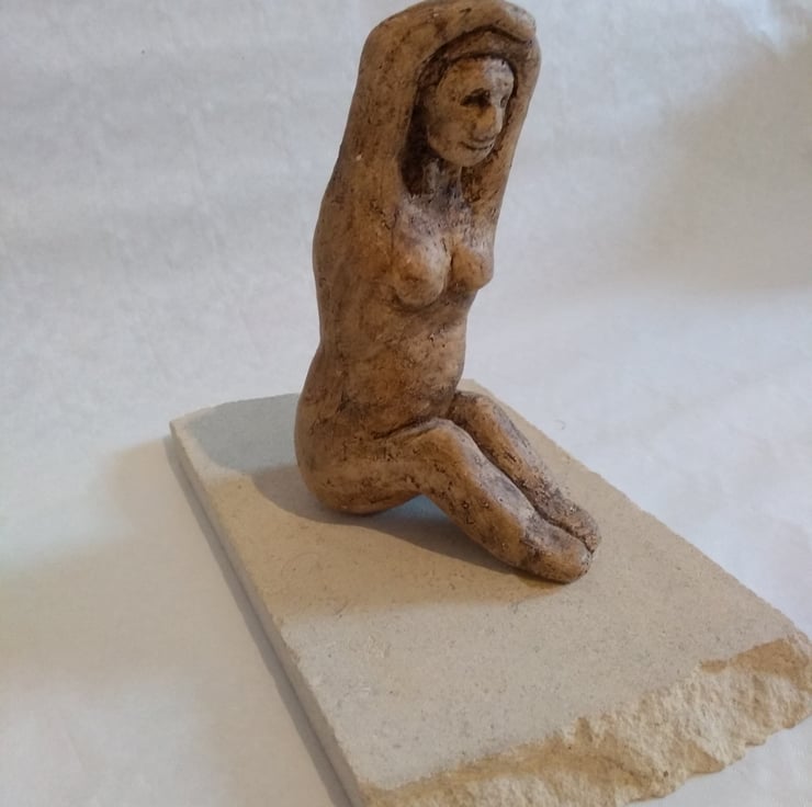 She sits on an off cut of flat stone. SIZE 17 cms high