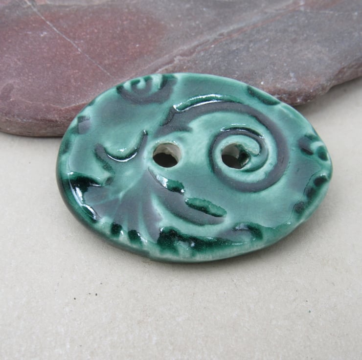 Large Emerald Green Brocade Oval Handmade Ceramic Button