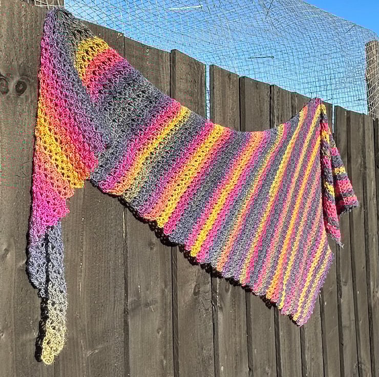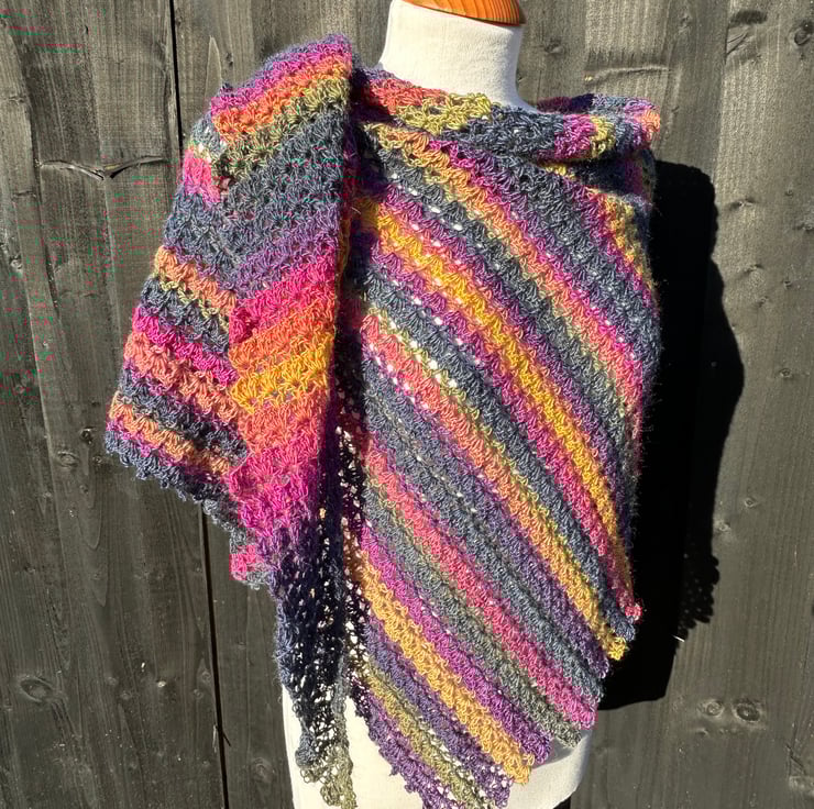 Hand crafted by me out of colourful sock wool yarn. This yarn has a very high wool content but it is very soft, ideally for sock knitting.