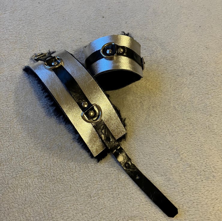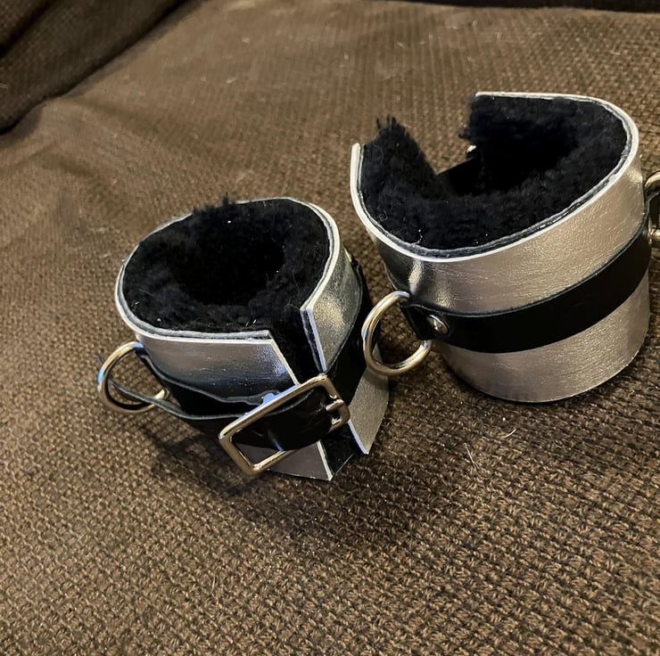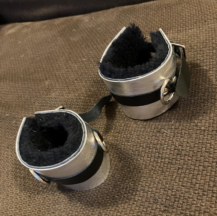 Silver coloured Leather, Lightweight Fur Lined Love Cuffs (8" wrist or smaller)