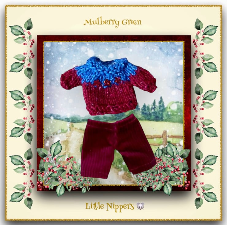 A cute little pair of burgundy corduroy trousers and a red and blue jumper, decorated with red sequins, made specially to fit the Little Nippers.