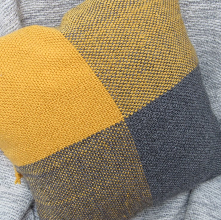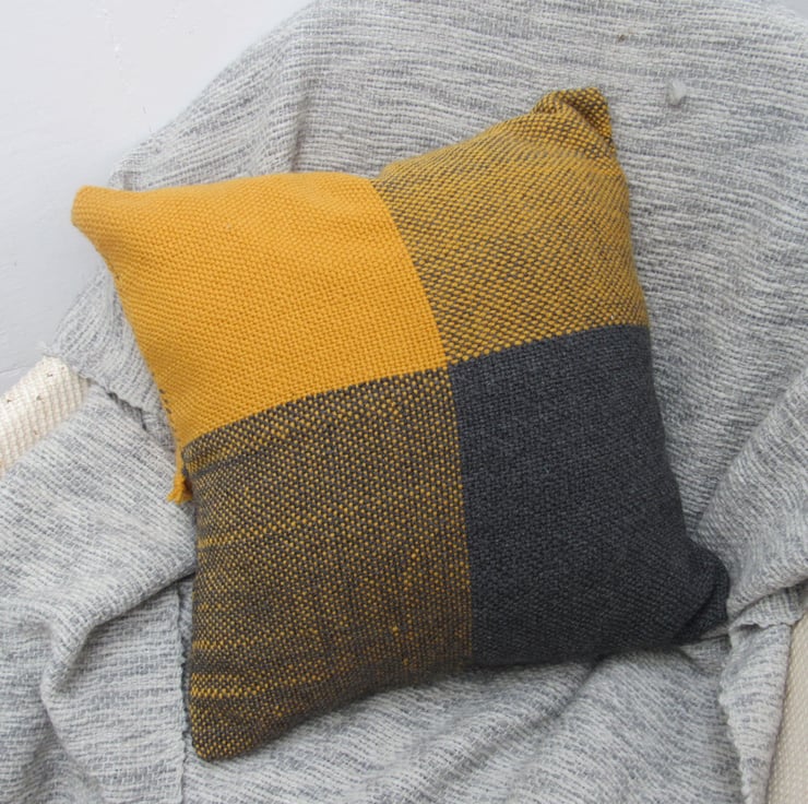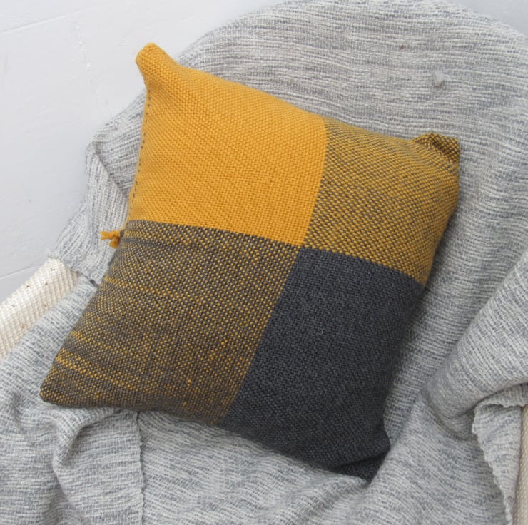 Handwoven cushion cover made from yellow and grey blended yarns, playing with weft and warp to give a shaded effect.