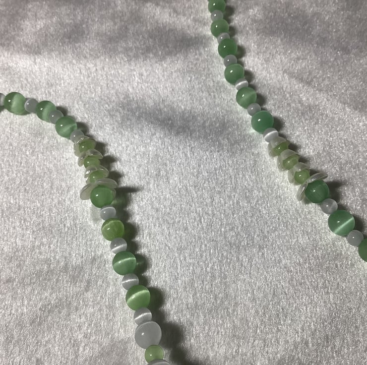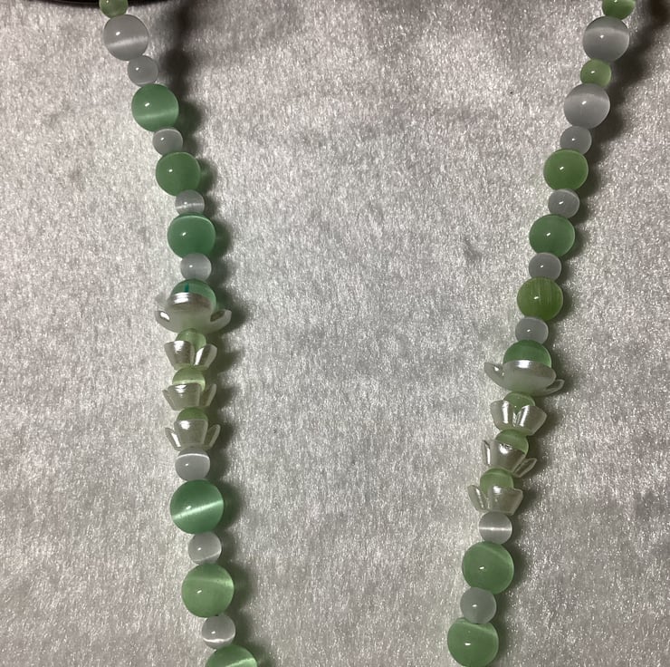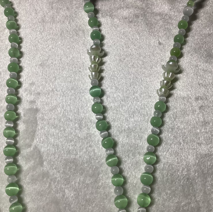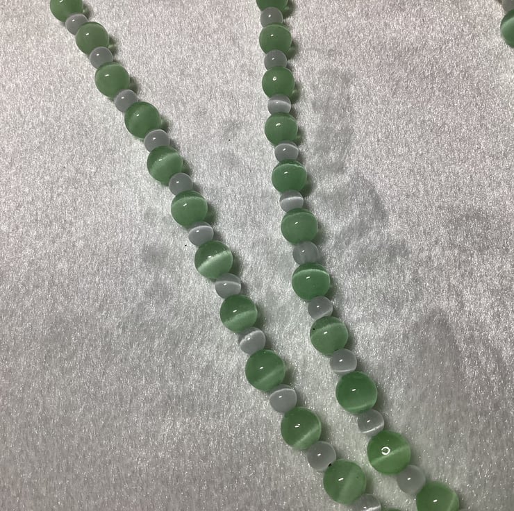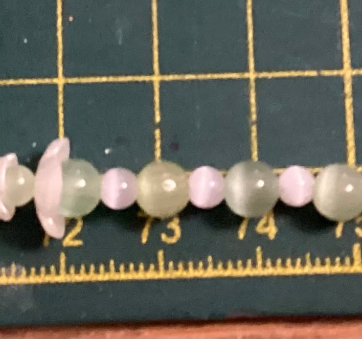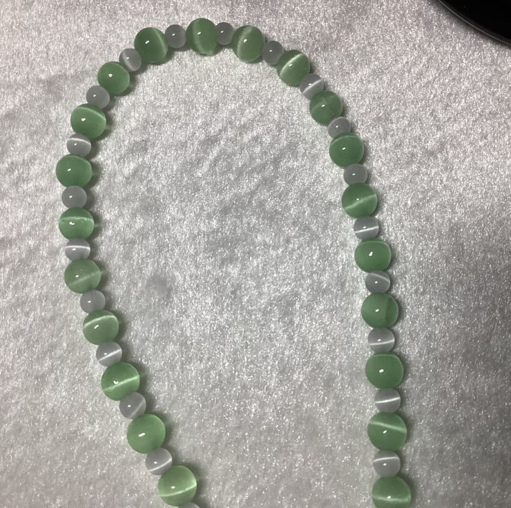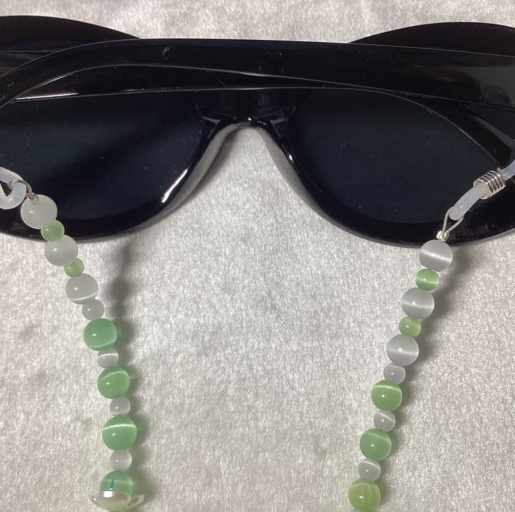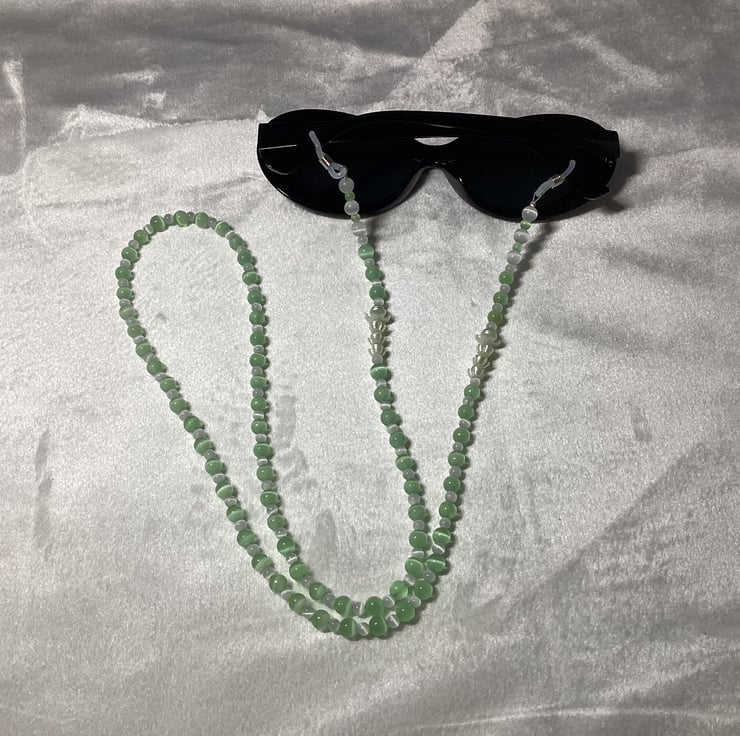 I always used Beadalon wire . Strand is the most flexible, the most durable. I’ve used Natural Moon Stone Beads in light green and white Cat Eye Beads with 20 mm Rubber Connectors . This chain allows glasses to be comfortably hung on your chest.
