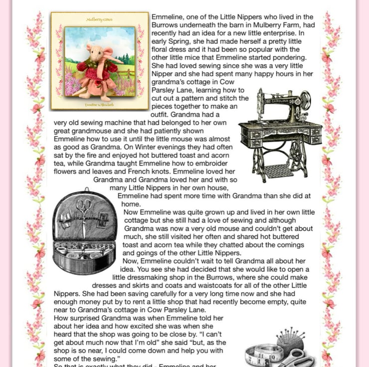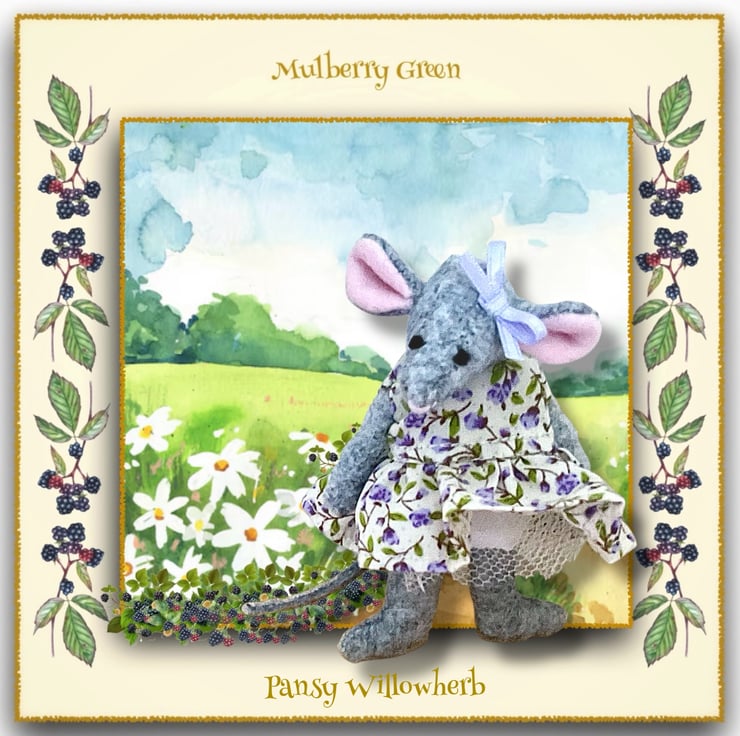Pansy Willowherb, dressed in a pretty purple sprig dress with net underskirt and a lavender bow, is a Pip Squeak - a young Little Nipper. Little Nippers are tiny wood mice who live in a maze of tunnels underneath the barn at Mulberry Farm. All of the Little Nippers are named after herbs and meadow flowers. Pip Squeaks are 11cm tall. Clothes made especially to fit them are also available in my shop.
