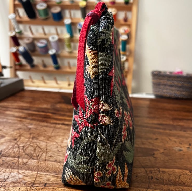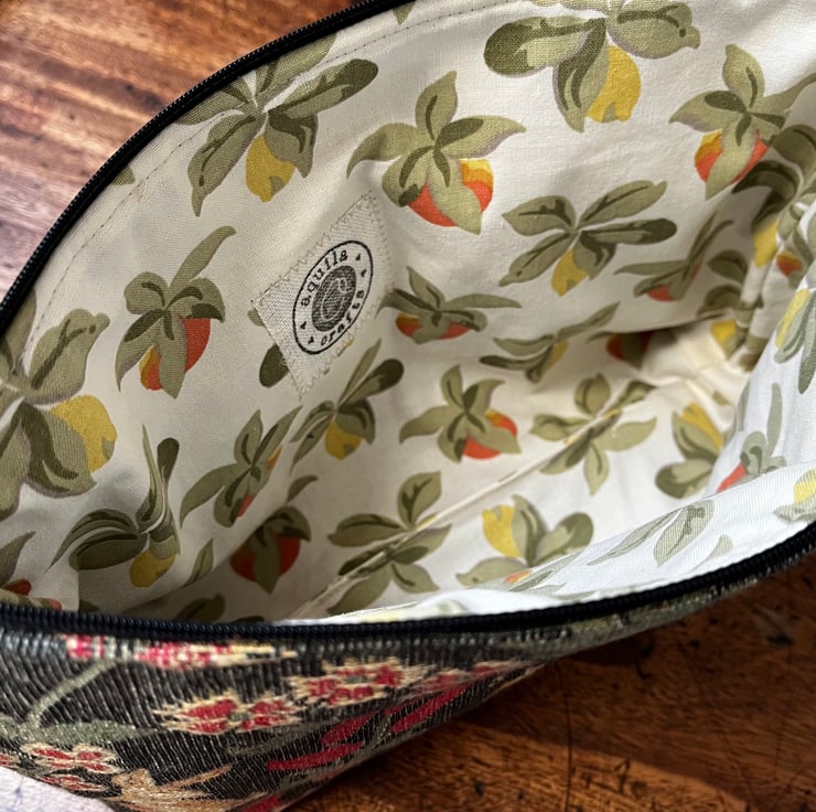 The bag is lined with reclaimed Laura Ashley cotton with a print of citrus fruits and there is a layer of interfacing between the layers for structure.