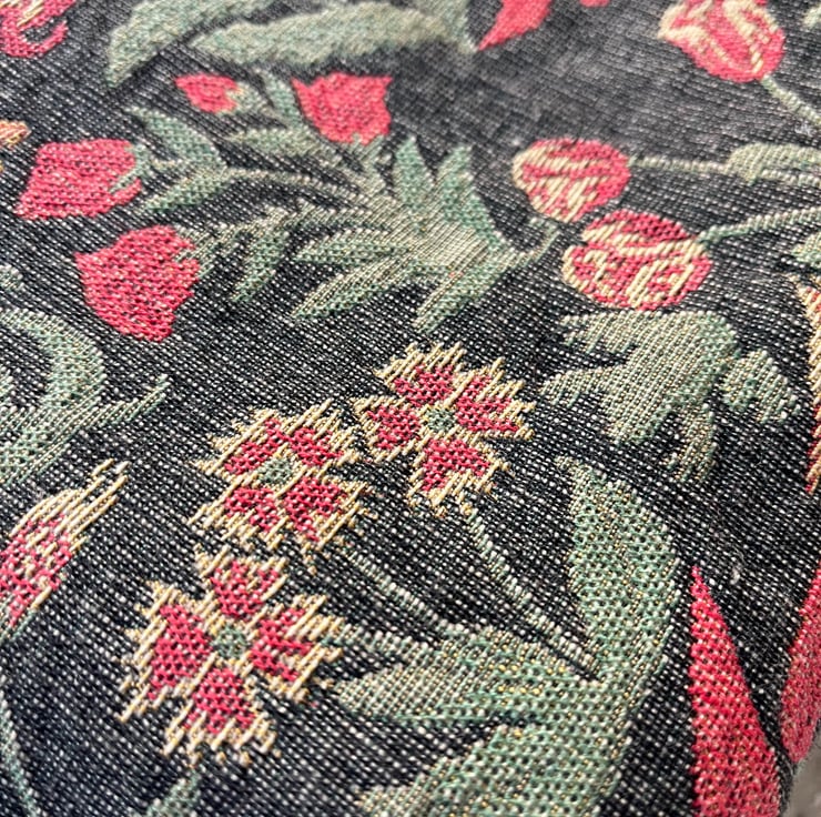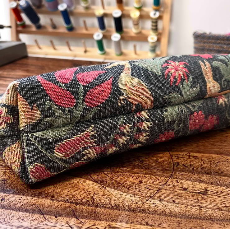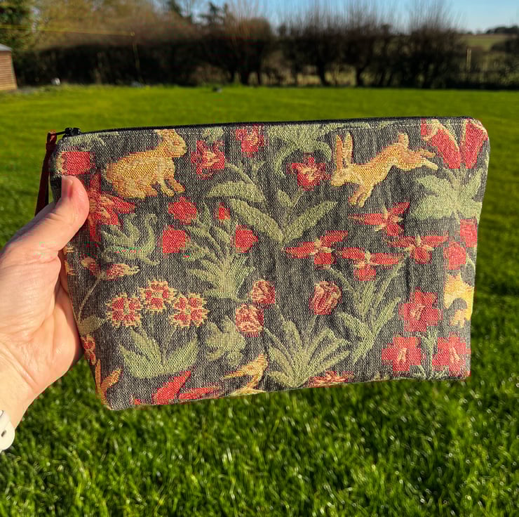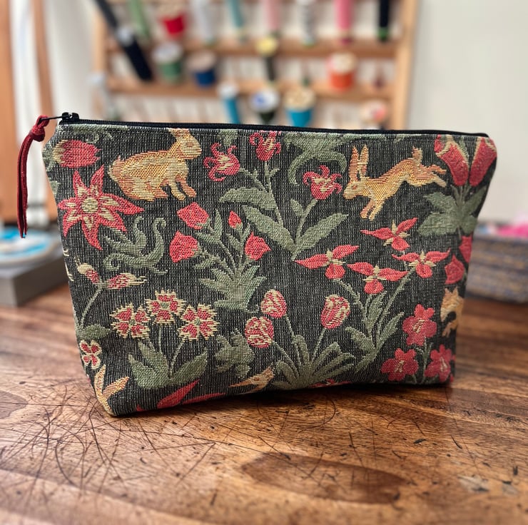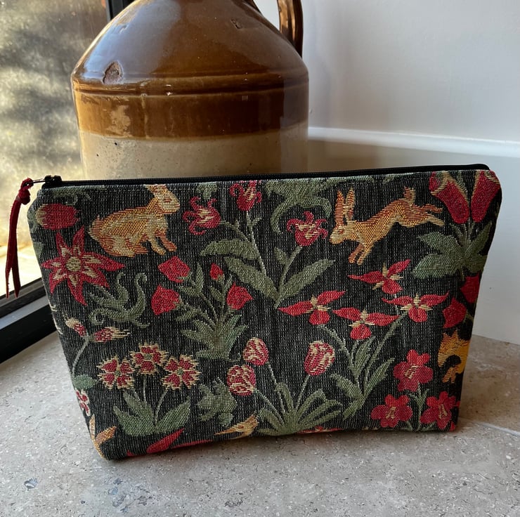 Large zip pouch ideally sized for organising your everyday essentials in your handbag. This unusual tapestry fabric was reclaimed from a thick door curtain. It has rabbits, birds and other animals on a dark grey background.