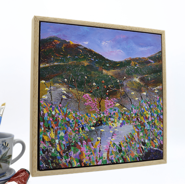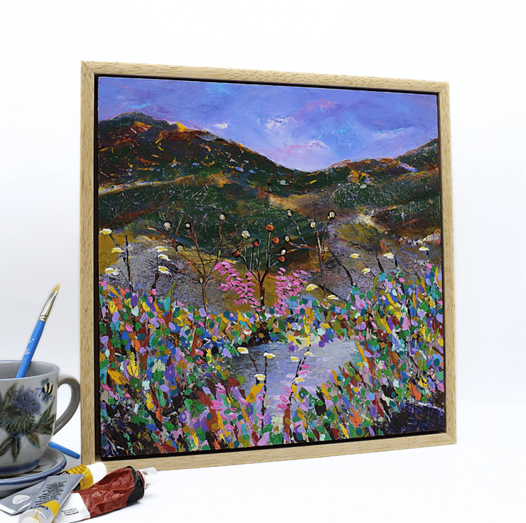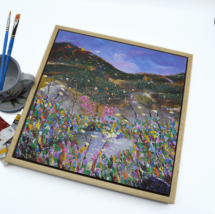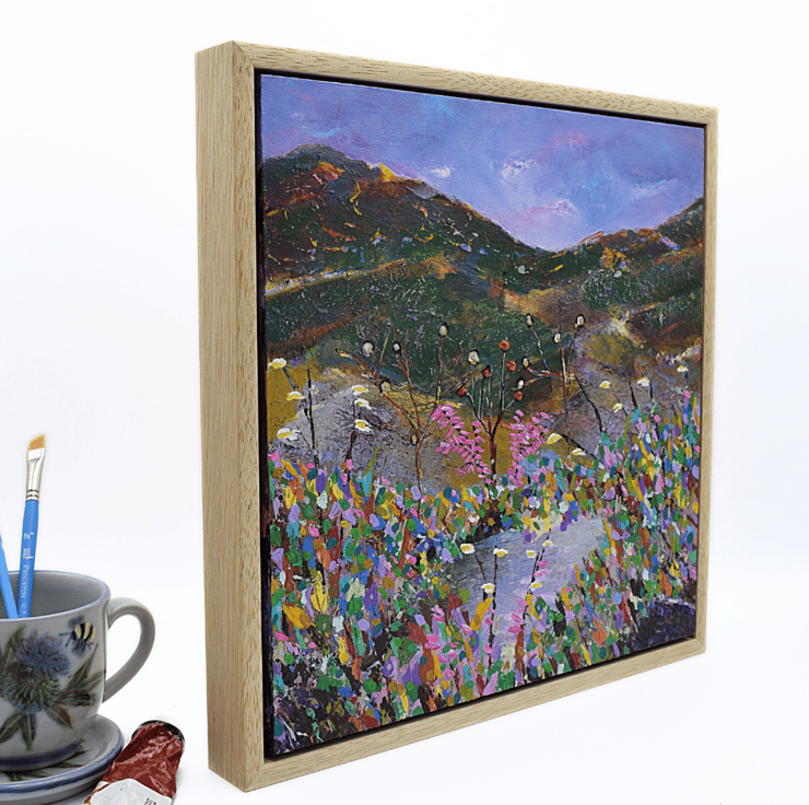 This is a framed landscape painting. It features mountains, a loch and wildflowers in the Cairngorms, Scotland. I have painted the sky using sweeping, fast brushstrokes. The mountains have been completed by applying thick layers of paint and then scraping some of the paint off in order to apply another layer. The wildflowers are abstract in nature and I've used a painting knife to give the impression of volume and density.