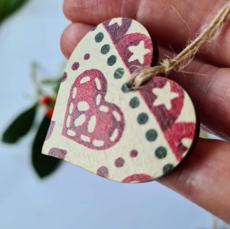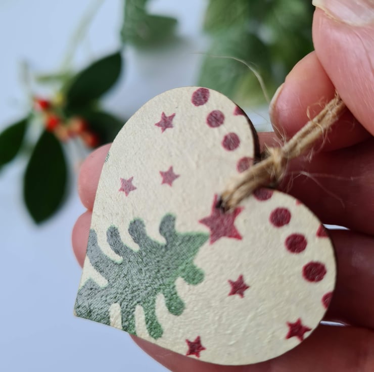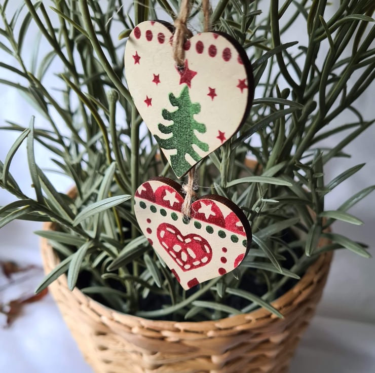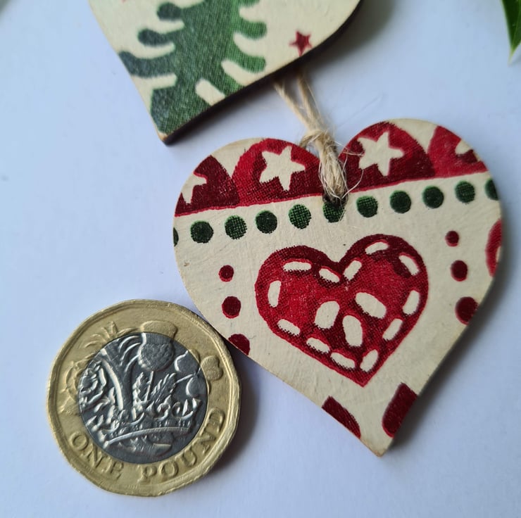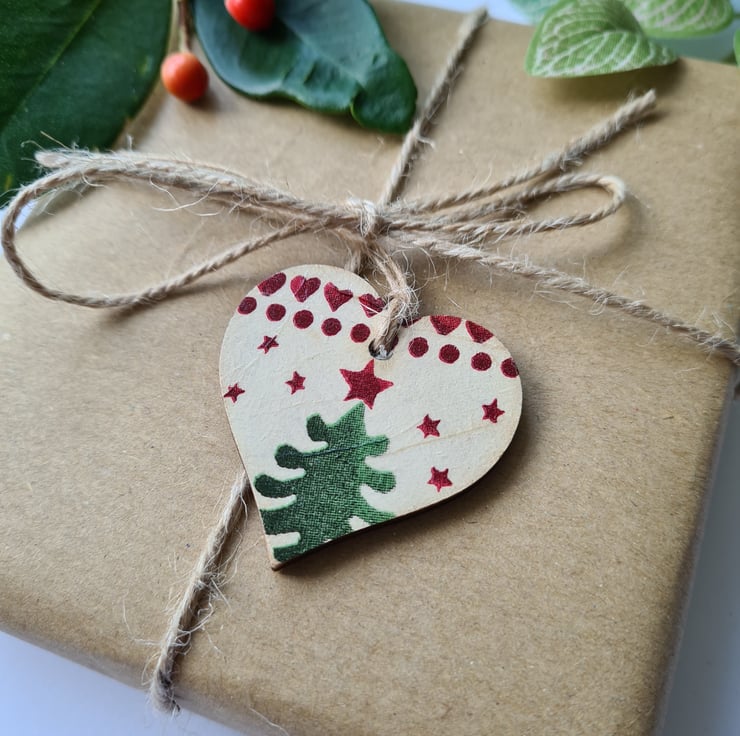 This set of two wooden mini hearts is decorated with decoupage using an Emma Bridgewater Christmas design with a Christmas tree on one and a heart on the other. They've been sealed with satin varnish and finished with jute twine which is left untied. These gift tags would make any gift extra special, and can also be used as Christmas decorations for the tree, so will be a pretty keepsake for the recipient! Or you could buy a few for yourself for your own decorations, or to make a garland!