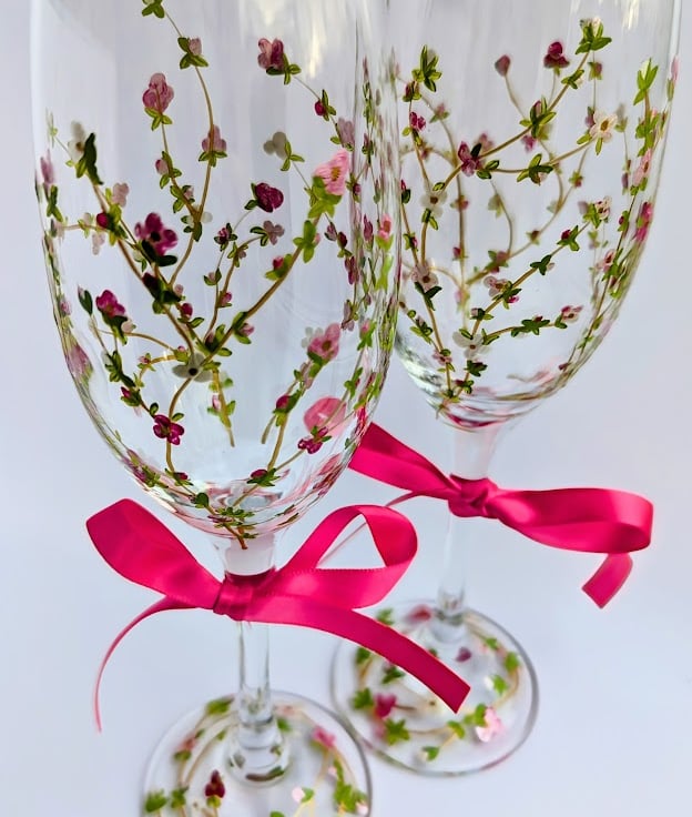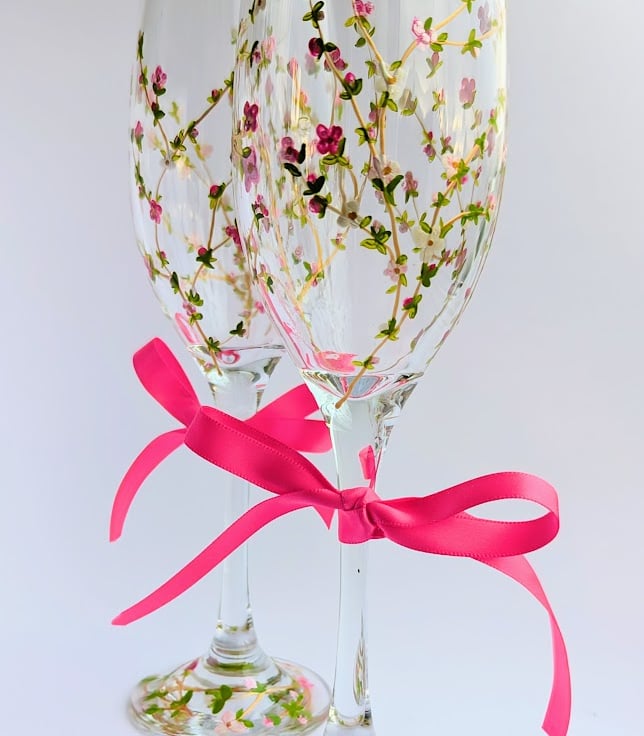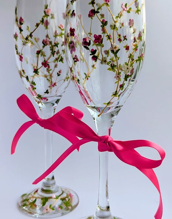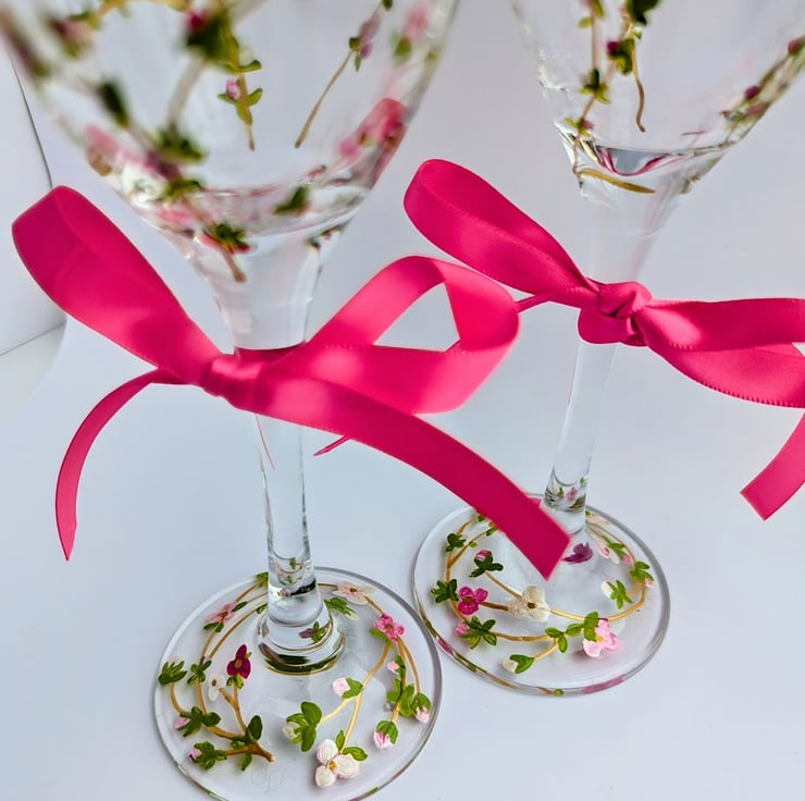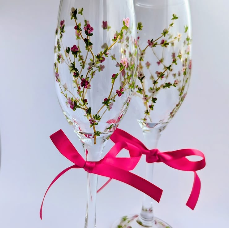 Pair of hand painted champagne flutes.. Beautifully finished and completely bespoke. Made to order within 72 hours. Dishwasher Safe (top shelf). Perfect for weddings, engagement gifts or gift for someone special/special occasion.