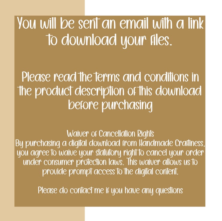Refund Policy for Digital Downloads Acceptance of Terms By completing your purchase, you acknowledge and accept this refund policy. At Handmade Craftiness, we are committed to providing high-quality digital products. Please read our refund policy carefully before making a purchase: Waiver of Cancellation Rights By purchasing a digital download from Handmade Craftiness, you agree to waive your statutory right to cancel your order under consumer protection laws. This waiver allows us to provide prompt access to the digital content. No Refunds After Download For digital downloads, consumers are required to waive their cancellation rights before the digital content can be provided. This means that once a customer (i.e., the consumer) has downloaded the content, they have given up their consumer rights to a refund. This policy aligns with consumer law for digital goods, ensuring the protection of intellectual property and preventing unauthorized distribution. Cancelling a Digital Download Under the Consumer Contracts Regulations 2013, digital downloads are neither goods nor services, meaning the law is a little different. If you want to download something within 14 days of buying it (known as the 'cooling-off’ period), you must give your consent to waive the 14-day cooling-off period. If you do not give your consent, the 14-day cooling-off period still applies. However, you will not be able to download your digital content until this period has ended. This policy exists to prevent customers from changing their minds after downloading the content. As you are being sent a link via email to download after purchase this will count as downloading the content as you will have access to download the files from the email. Eligibility for Refunds Refunds may only be issued under exceptional circumstances, such as: The digital content is proven to be defective or incomplete. An error on our part (e.g., duplicate billing). Contact Us If you believe you are eligible for a refund due to one of the exceptional circumstances above, please contact us at orders@handmadecraftiness.co.uk with your order details, a description of the issue, and proof of purchase. Our team will review your request and respond within 7 business days. For further inquiries, please contact us at orders@handmadecraftiness.co.uk. ------------------------------------------------------------------------------------------------------------------------------------------------------------- Ownership and Usage: All artwork within this shop is the exclusive property of Handmadecraftiness. You are expressly prohibited from reproducing, altering, redistributing, reselling, or claiming ownership of any digital item from this store. However, you are permitted to incorporate products from this store into your own physical handmade items for sale as a hobbyist. TERMS OF USE 1. You may print and use these items in a tangible journal/scrapbook/craft project etc. 2. You MAY NOT sell or share these files. 3. You MAY NOT reproduce/altar/redistribute our designs as a digital or physical item. 4. You MAY NOT sell or manipulate these files for resale purposes. 5. You MAY NOT share these files individually or as kits.