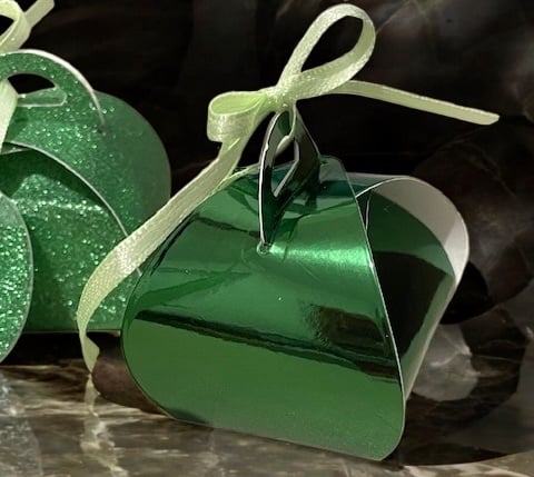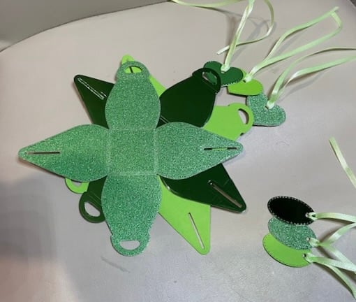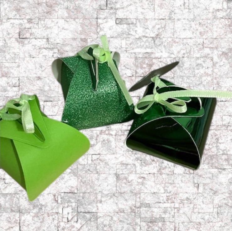 A pack of 6 small green gift bags/gift boxes plus matching tags. Ideal to hold little treats for your party guests on St Patrick’s Day
