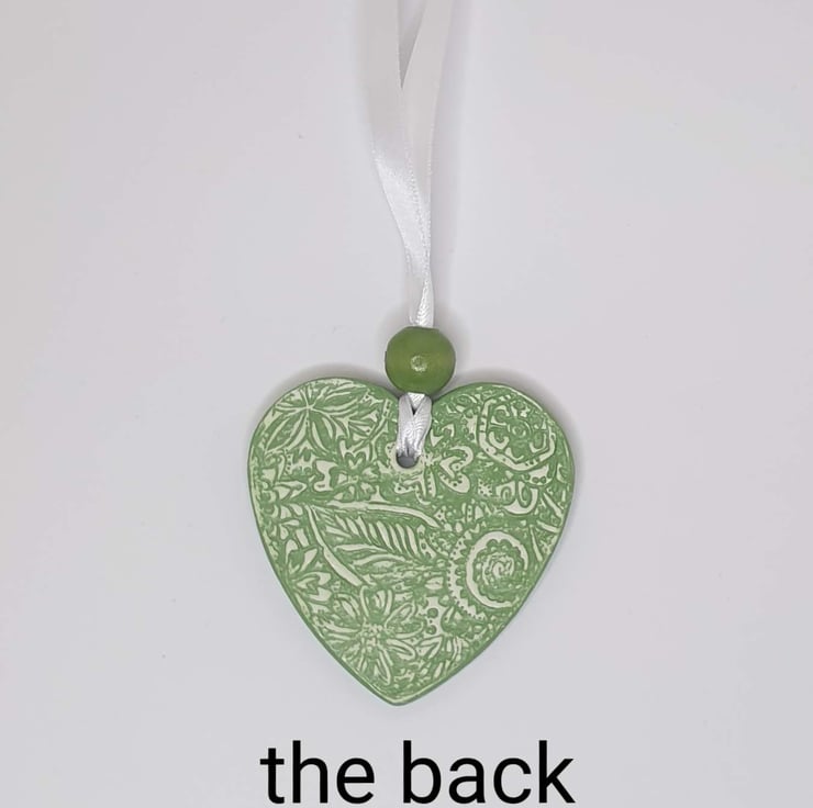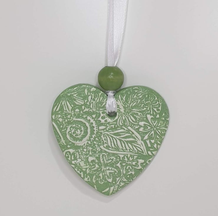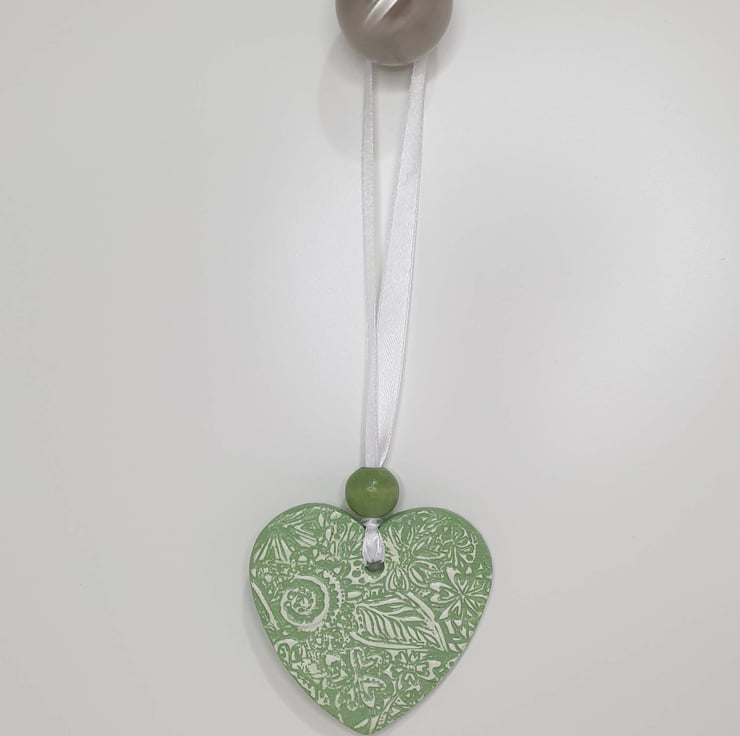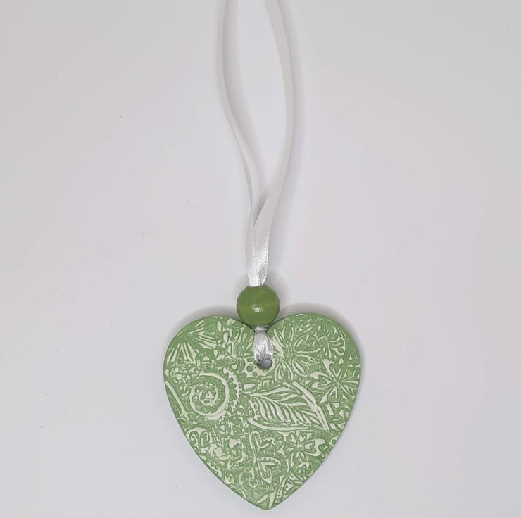 Decorative pastel green and white clay heart decoration. This hanging heart has been lovingly created from air dry clay and then imprinted with a floral pattern on both sides. This pretty heart has been coloured with acrylic paint and then varnished. The heart comes ready to hang from white satin ribbon finished with a matching pale green wooden bead and would look great hung in a window or from a handle or knob. This decorative heart would make a lovely gift for a birthday, Mother's day, anniversary or Valentine's day.