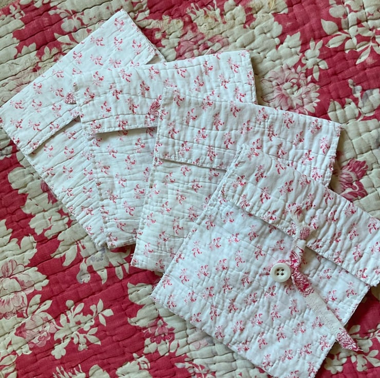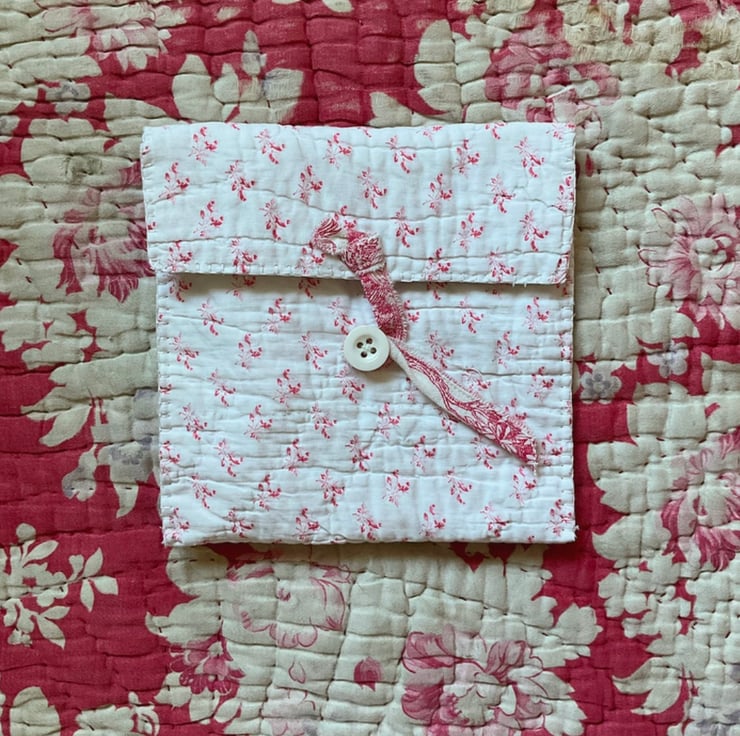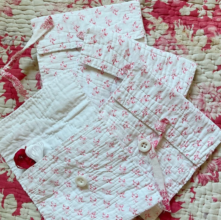A gorgeous vintage quilt pouch, designed to hold your embroidery skeins, or small sewing projects.