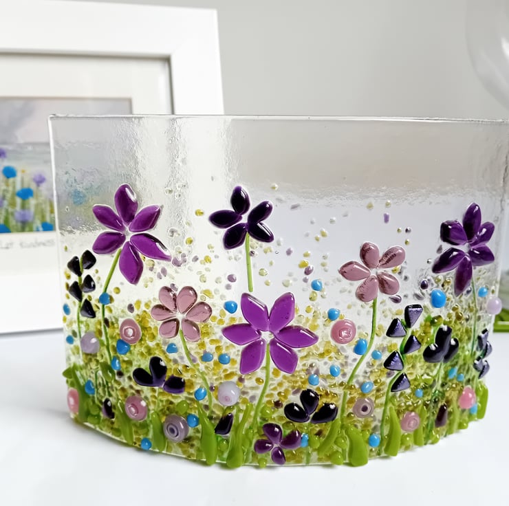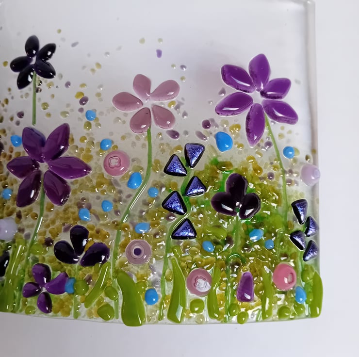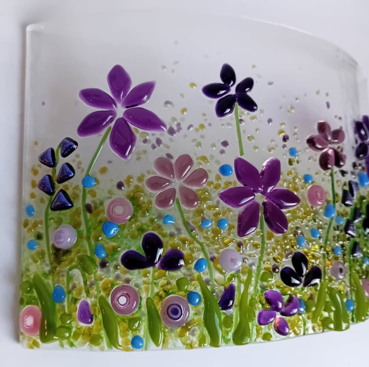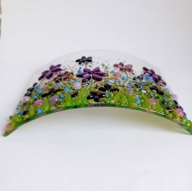 Vibrant purples catch the light and stand out against the green stems, all fused onto a clear glass base. The item has been fused twice, once to fuse the details together and once to slump it into the curved shape, each fusing schedule taking approximately 9 hours from start to finish.