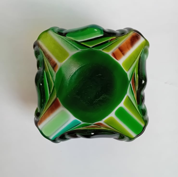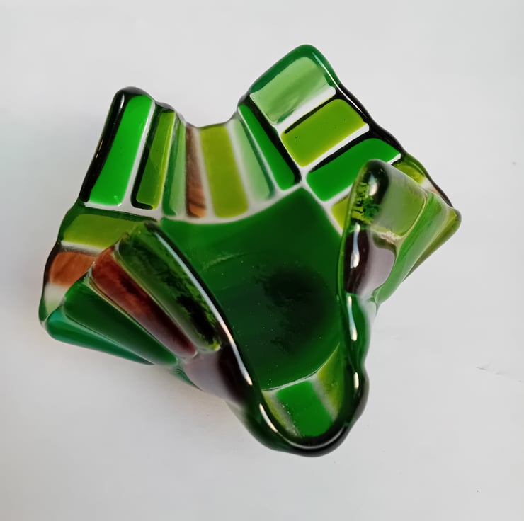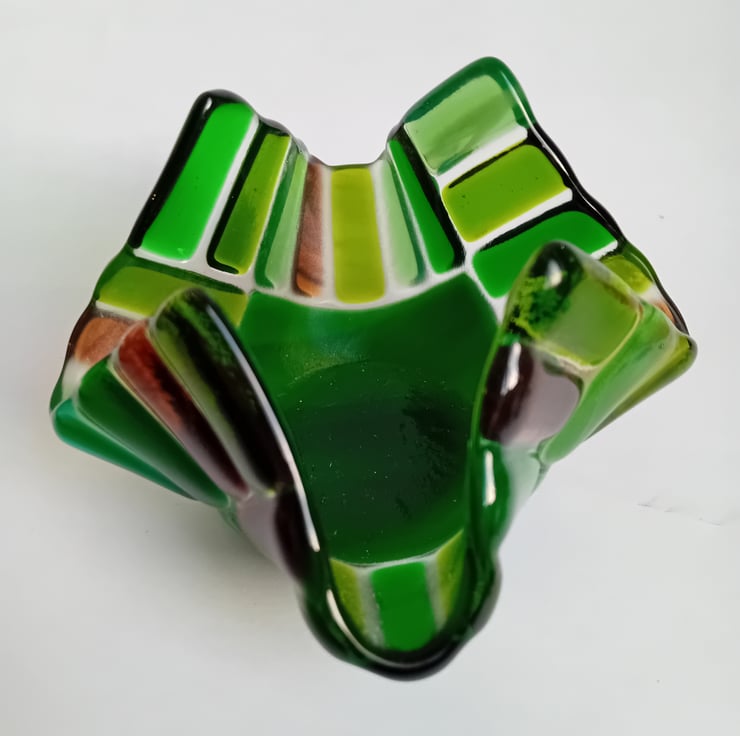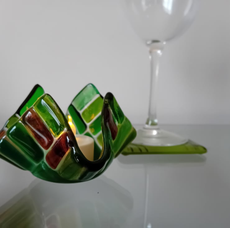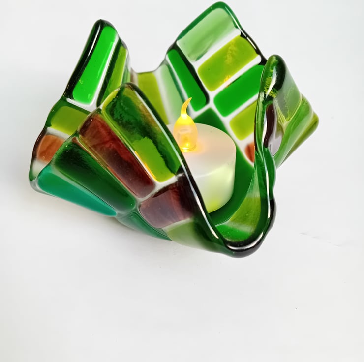 A handmade fused glass tealight holder created from individually handcut pieces of green and brown glass. Once cut and placed into the design, the pieces of glass are heated enough to fuse them together whilst retaining some texture. Following this, it is fused again to a lower temperature to allow the glass to retain it's texture but soften enough to be reshaped into the soft waves of this tealight holder. This process takes about 24 hours in total.