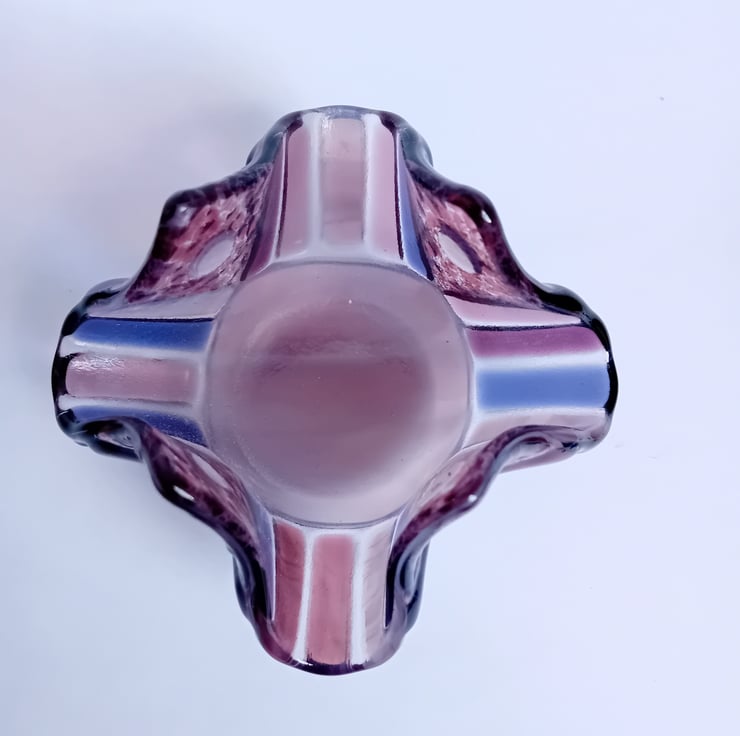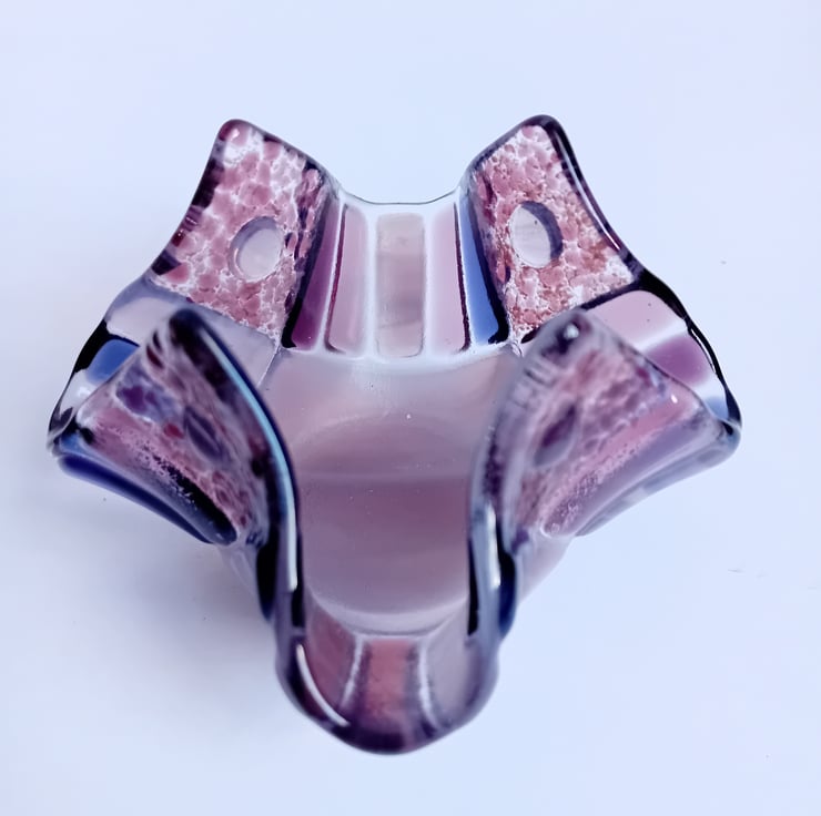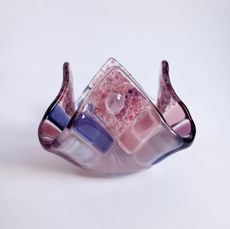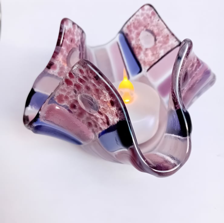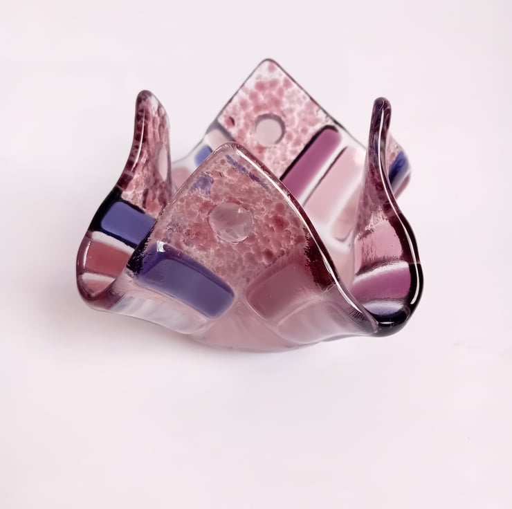 A handmade fused glass tealight holder created from individually handcut pieces of purple and lilac glass. Once cut and placed into the design, the pieces of glass are heated enough to fuse them together whilst retaining some texture. Following this, it is fused again to a lower temperature to allow the glass to retain it's texture but soften enough to be reshaped into the soft waves of this tealight holder. This process takes about 24 hours in total.